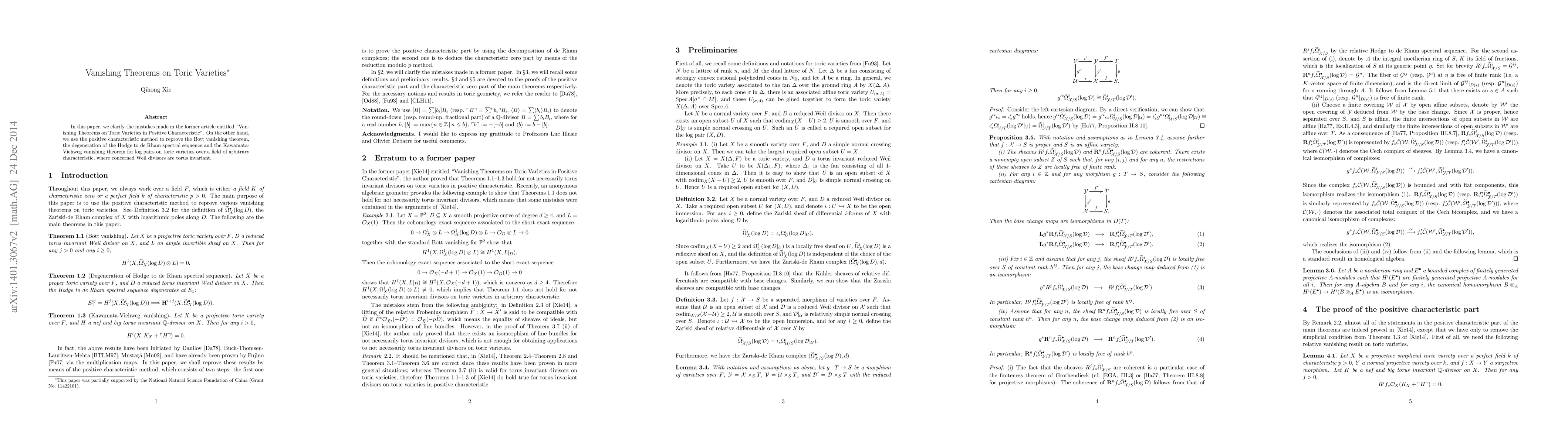 Summary: This paper corrects errors in a previous article and uses positive characteristic techniques to reaffirm several vanishing theorems—Bott, Hodge-to-de Rham spectral sequence degeneration, and Kawamata-Viehweg—for toric varieties, irrespective of the underlying field's characteristic, focusing on torus-invariant Weil divisors.