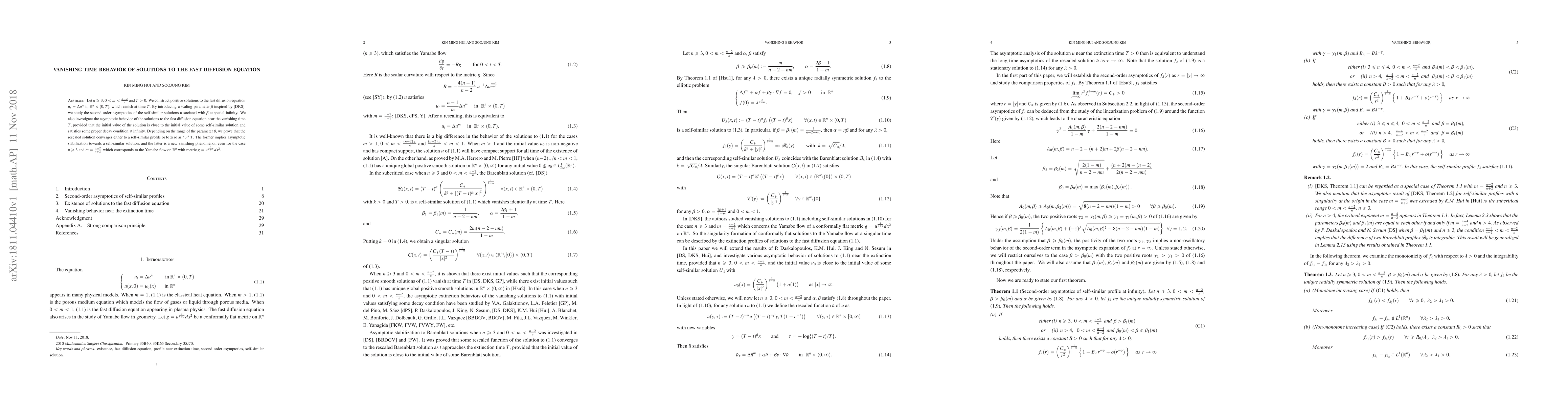 This research paper studies solutions to the fast diffusion equation that vanish at time T, showing two possible asymptotic behaviors: convergence to a self-similar solution or vanishing towards zero, depending on the parameter beta.