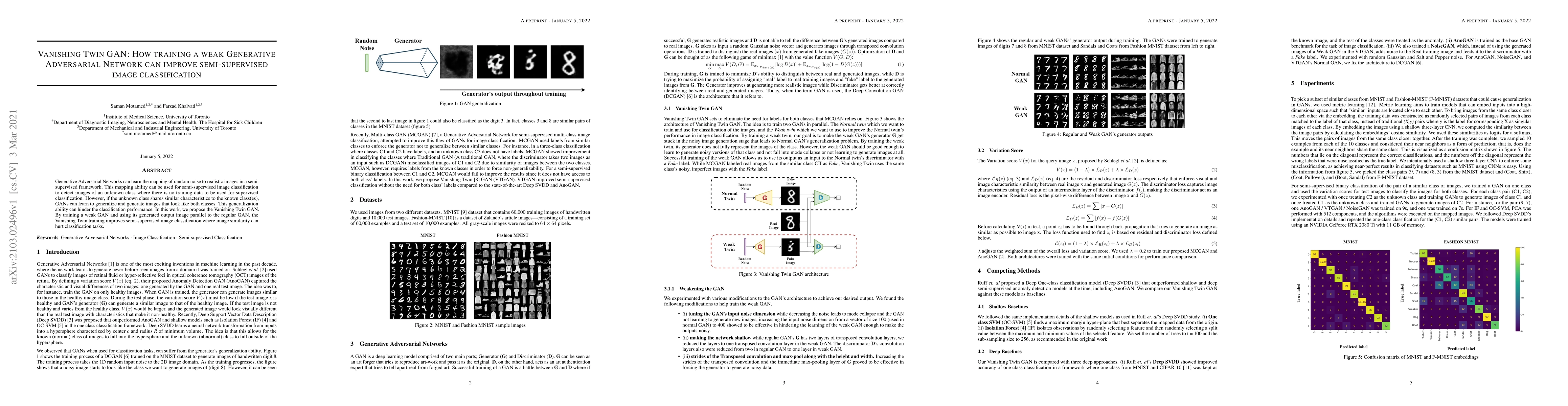 Generative Adversarial Networks can learn the mapping of random noise to realistic images in a semi-supervised framework. This mapping ability can be used for semi-supervised image classification to detect images of an unknown class where there is no training data to be used for supervised classification. However, if the unknown class shares similar characteristics to the known class(es), GANs can learn to generalize and generate images that look like both classes. This generalization ability can hinder the classification performance. In this work, we propose the Vanishing Twin GAN. By training a weak GAN and using its generated output image parallel to the regular GAN, the Vanishing Twin training improves semi-supervised image classification where image similarity can hurt classification tasks.