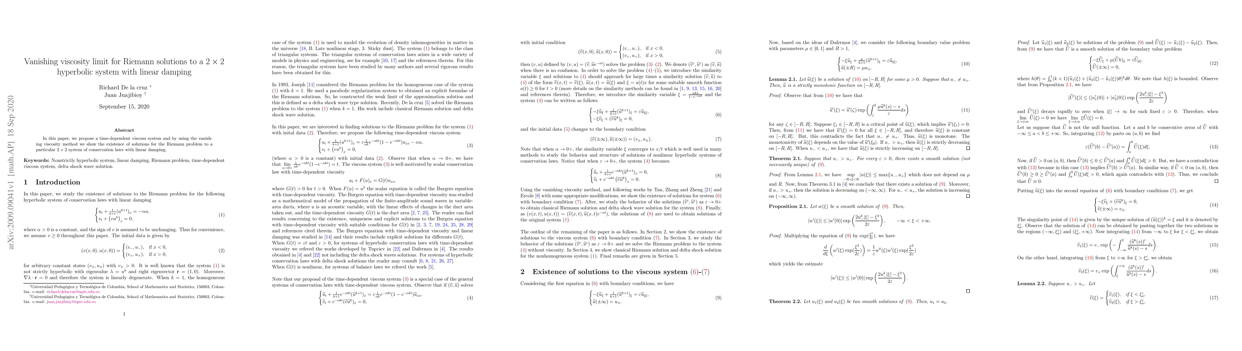 Researchers developed a time-dependent viscous system to study 2x2 hyperbolic systems with linear damping, finding the existence of delta shock solution solutions for the Riemann problem.
