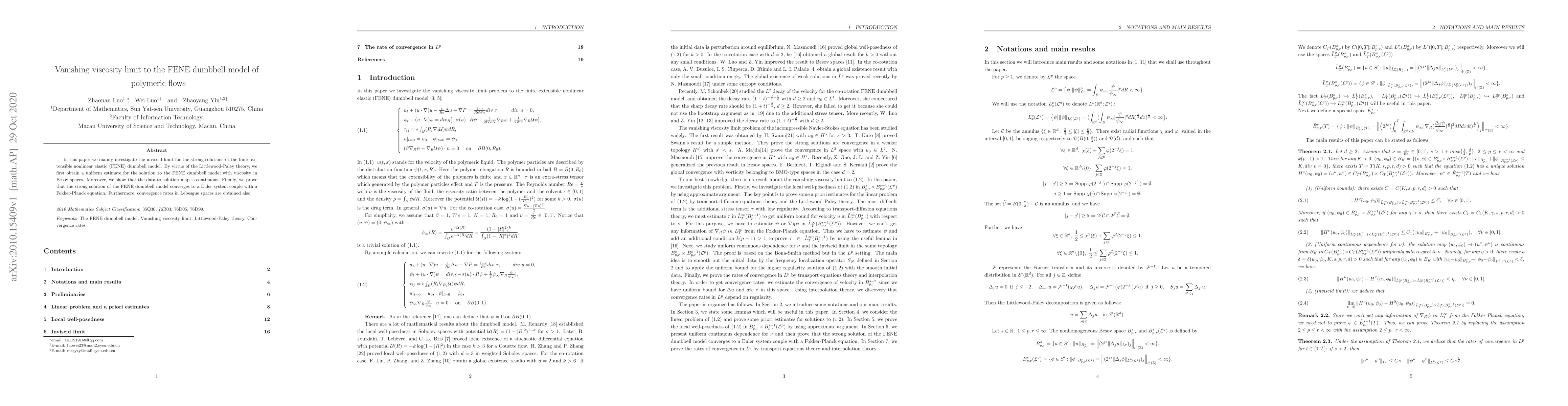 This paper investigates the vanishing viscosity limit for the FENE dumbbell model, proving uniform estimates in Besov spaces and continuity of the data-to-solution map. It demonstrates convergence of strong solutions to an Euler system coupled with a Fokker-Planck equation, along with convergence rates in Lebesgue spaces.