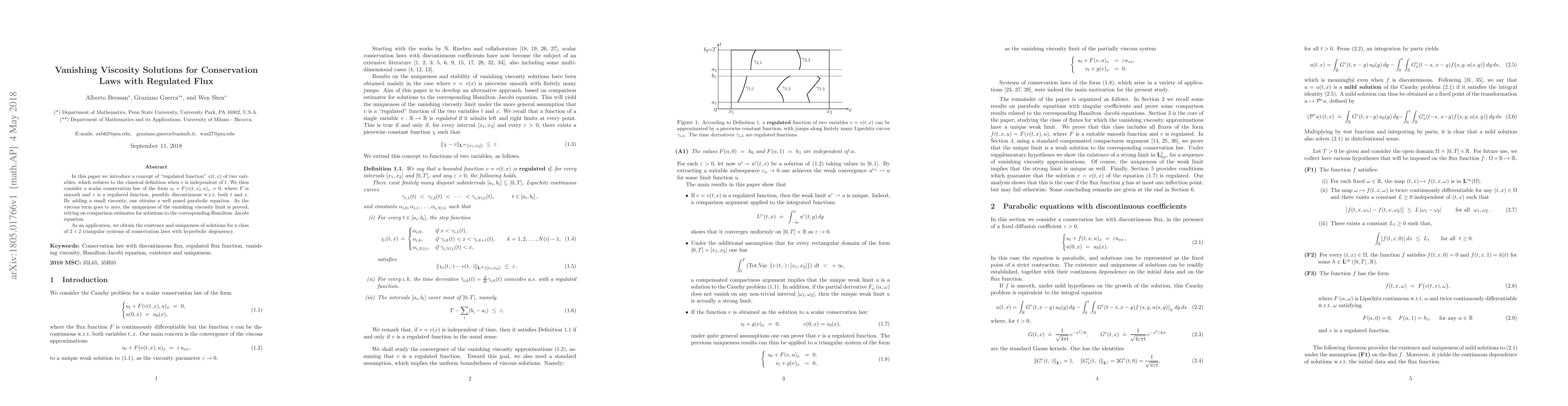 This paper introduces a concept of "regulated function" to extend classical conservation laws, where the flux function can be discontinuous in both time and space. It proves the uniqueness of vanishing viscosity solutions by leveraging comparison estimates for Hamilton-Jacobi equations, and applies the method to establish existence and uniqueness for hyperbolic degenerate triangular systems of conservation laws.