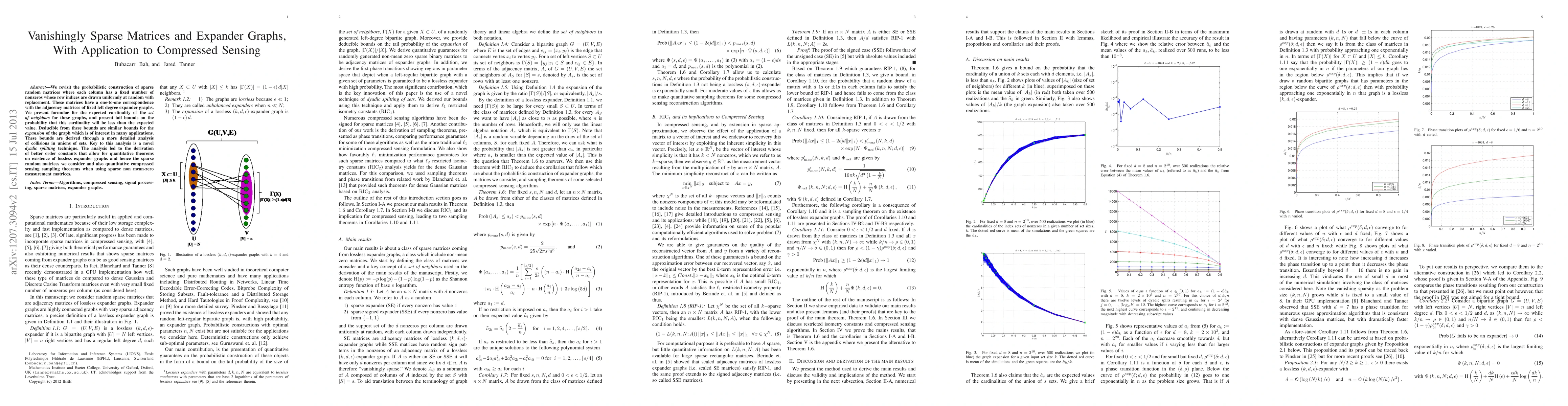 This paper explores the probabilistic construction of vanishingly sparse random matrices linked to fixed left degree expander graphs, employing a novel dyadic splitting technique. It derives improved bounds on the expansion properties of these graphs, which enhance compressed sensing sampling theorems for sparse measurement matrices.
