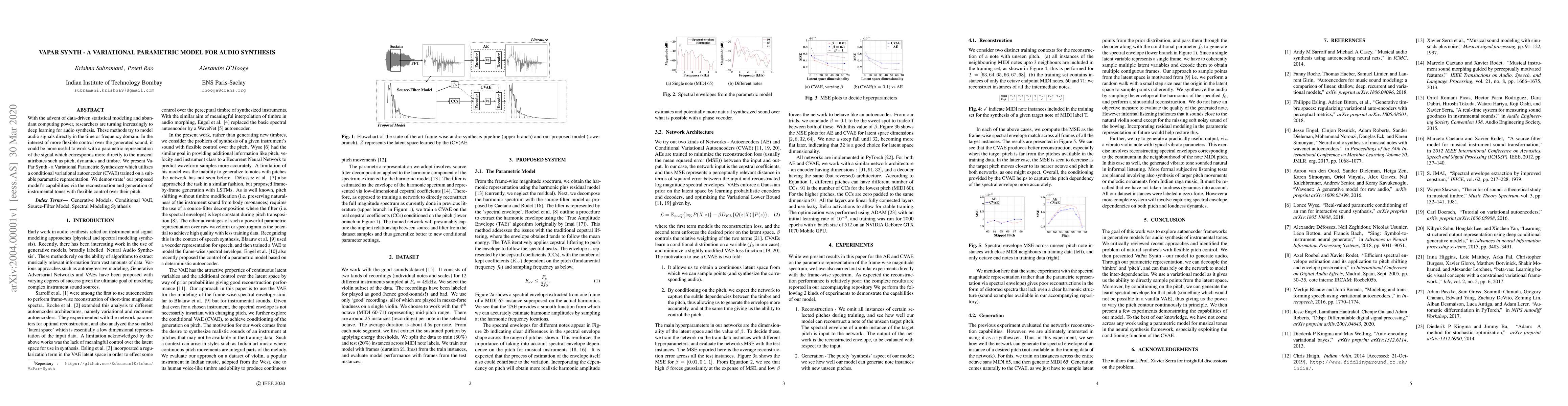 With the advent of data-driven statistical modeling and abundant computing power, researchers are turning increasingly to deep learning for audio synthesis. These methods try to model audio signals directly in the time or frequency domain. In the interest of more flexible control over the generated sound, it could be more useful to work with a parametric representation of the signal which corresponds more directly to the musical attributes such as pitch, dynamics and timbre. We present VaPar Synth - a Variational Parametric Synthesizer which utilizes a conditional variational autoencoder (CVAE) trained on a suitable parametric representation. We demonstrate our proposed model's capabilities via the reconstruction and generation of instrumental tones with flexible control over their pitch.