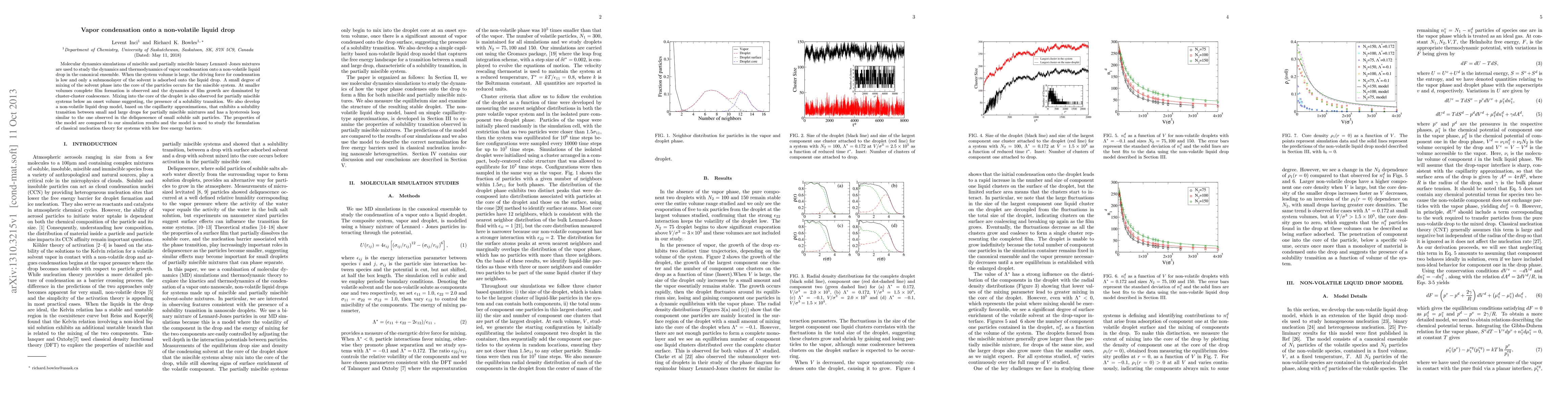 Molecular dynamics simulations of miscible and partially miscible binary Lennard--Jones mixtures are used to study the dynamics and thermodynamics of vapor condensation onto a non-volatile liquid drop in the canonical ensemble. When the system volume is large, the driving force for condensation is low and only a submonolayer of the solvent is adsorbed onto the liquid drop. A small degree of mixing of the solvent phase into the core of the particles occurs for the miscible system. At smaller volumes complete film formation is observed and the dynamics of film growth are dominated by cluster-cluster coalescence. Mixing into the core of the droplet is also observed for partially miscible systems below an onset volume suggesting, the presence of a solubility transition. We also develop a non-volatile liquid drop model, based on the capillarity approximations, that exhibits a solubility transition between small and large drops for partially miscible mixtures and has a hysteresis loop similar to the one observed in the deliquescence of small soluble salt particles. The properties of the model are compared to our simulation results and the model is used to study the formulation of classical nucleation theory for systems with low free energy barriers.