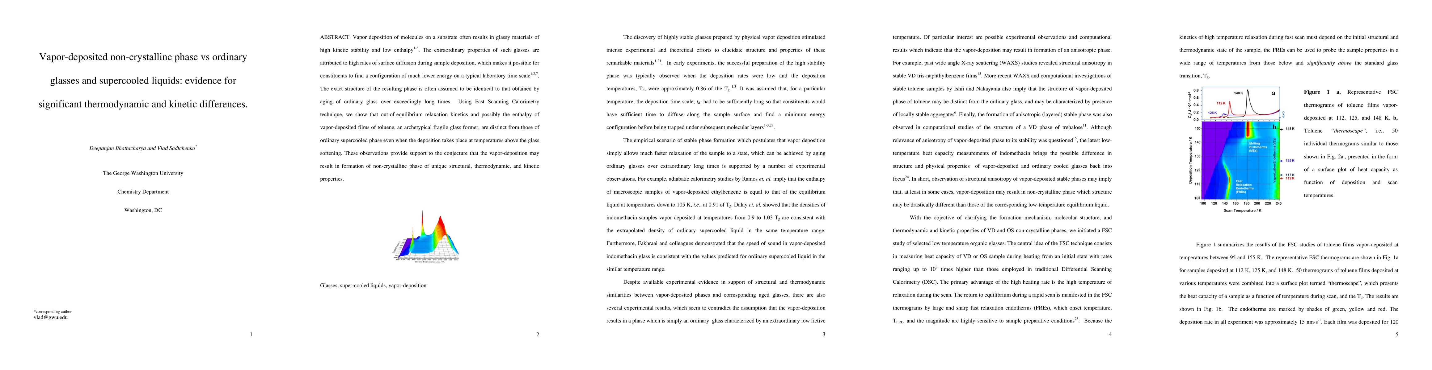 This study reveals that vapor-deposited non-crystalline phases exhibit distinct thermodynamic and kinetic behaviors compared to ordinary glasses and supercooled liquids, suggesting unique structural properties formed through high-rate surface diffusion during deposition. The findings, obtained via Fast Scanning Calorimetry, challenge the assumption that vapor-deposited glasses mirror the long-term aging of conventional glass.