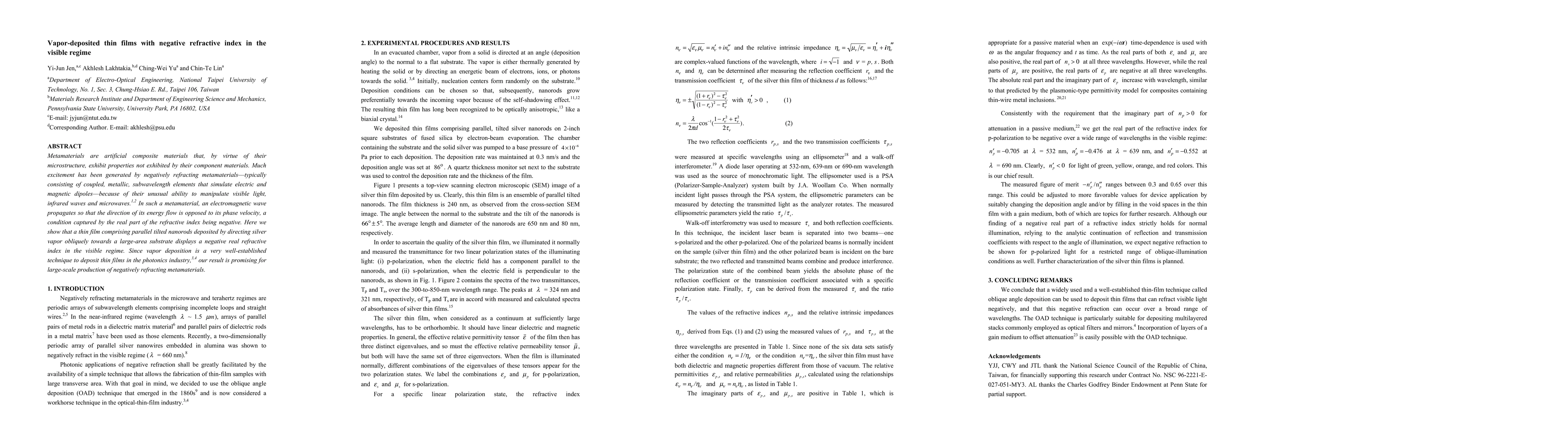 This paper demonstrates the fabrication of thin films using vapor deposition that exhibit a negative refractive index in the visible light spectrum, achieved through parallel tilted nanorods of silver. This method holds promise for scalable production of metamaterials with unique light manipulation properties.