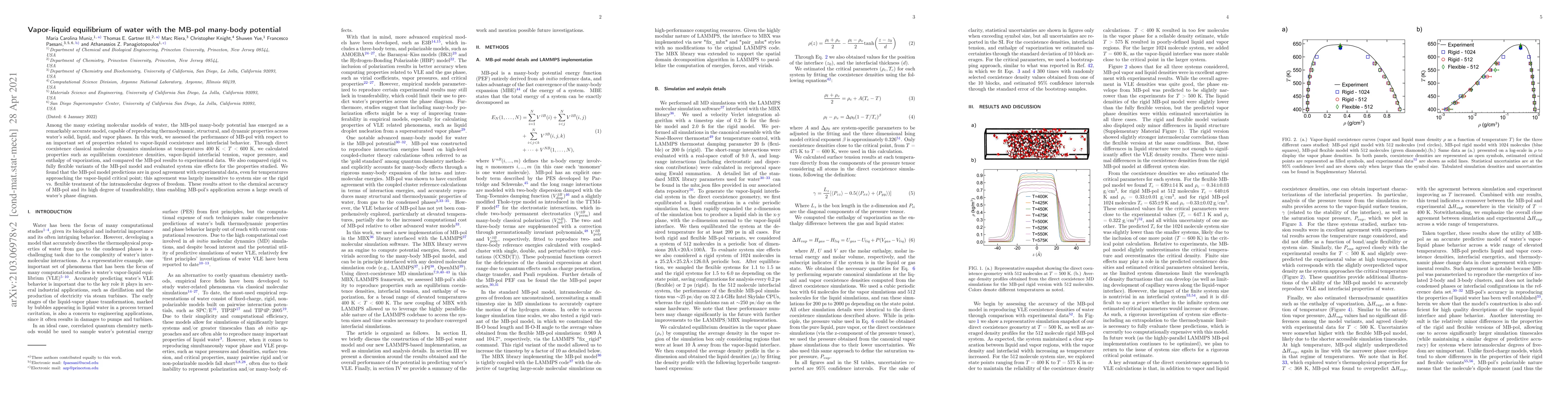 This paper evaluates the MB-pol many-body potential model's accuracy in predicting vapor-liquid equilibrium properties of water through molecular dynamics simulations. The MB-pol model shows good agreement with experimental data for properties like vapor pressure and interfacial tension, indicating its chemical accuracy and transferability across water's phase diagram.