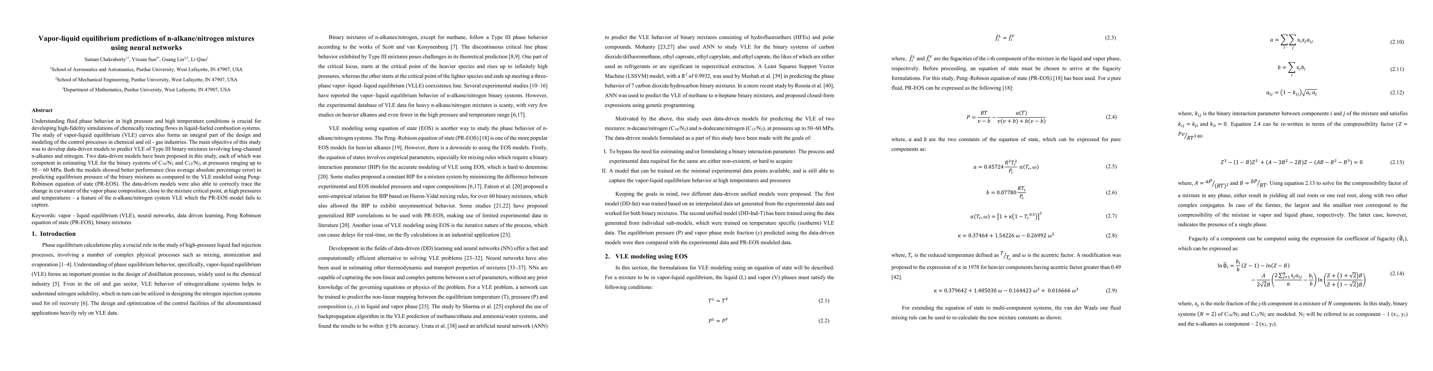This study develops neural network models to predict vapor-liquid equilibrium (VLE) for long-chain n-alkane/nitrogen mixtures at high pressures and temperatures, outperforming the traditional Peng-Robinson equation of state in accuracy and capturing complex VLE behavior near the mixture critical point.