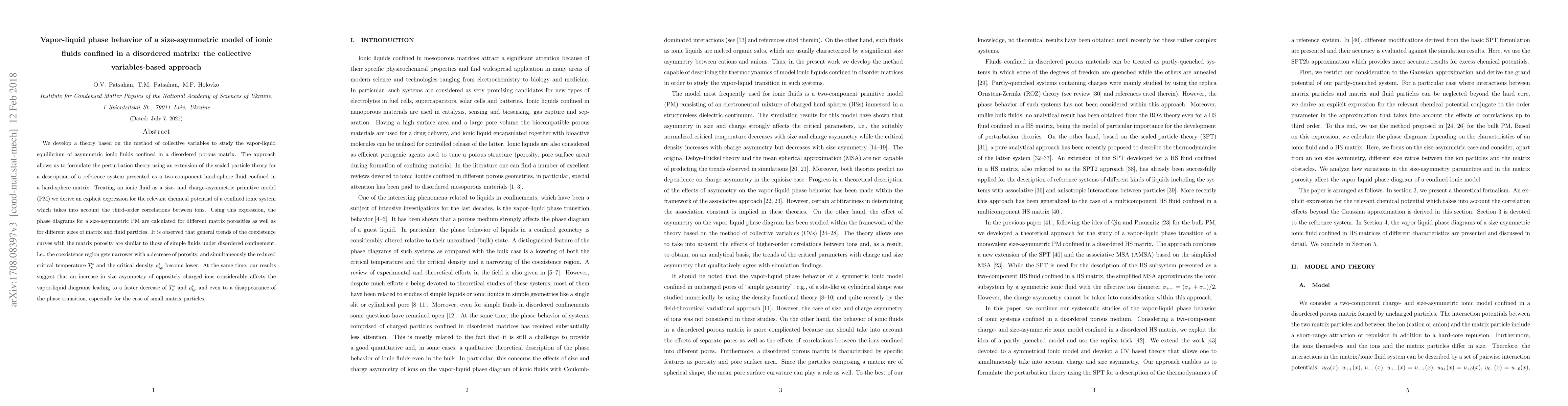 We develop a theory based on the method of collective variables to study the vapor-liquid equilibrium of asymmetric ionic fluids confined in a disordered porous matrix. The approach allows us to formulate the perturbation theory using an extension of the scaled particle theory for a description of a reference system presented as a two-component hard-sphere fluid confined in a hard-sphere matrix. Treating an ionic fluid as a size- and charge-asymmetric primitive model (PM) we derive an explicit expression for the relevant chemical potential of a confined ionic system which takes into account the third-order correlations between ions. Using this expression, the phase diagrams for a size-asymmetric PM are calculated for different matrix porosities as well as for different sizes of matrix and fluid particles. It is observed that general trends of the coexistence curves with the matrix porosity are similar to those of simple fluids under disordered confinement, i.e., the coexistence region gets narrower with a decrease of porosity, and simultaneously the reduced critical temperature $T_{c}^{*}$ and the critical density $\rho_{i,c}^{*}$ become lower. At the same time, our results suggest that an increase in size asymmetry of oppositely charged ions considerably affects the vapor-liquid diagrams leading to a faster decrease of $T_{c}^{*}$ and $\rho_{i,c}^{*}$ and even to a disappearance of the phase transition, especially for the case of small matrix particles.