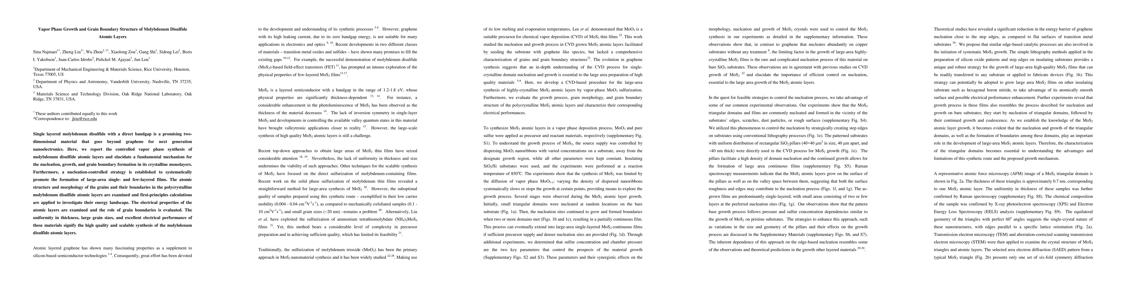 This research paper reports on the controlled vapor phase synthesis of high-quality molybdenum disulfide atomic layers, highlighting mechanisms for nucleation and growth, and examining grain boundary structures. The study demonstrates a scalable method to produce large-area, uniform films with excellent electrical properties, emphasizing the significance of grain boundaries.
