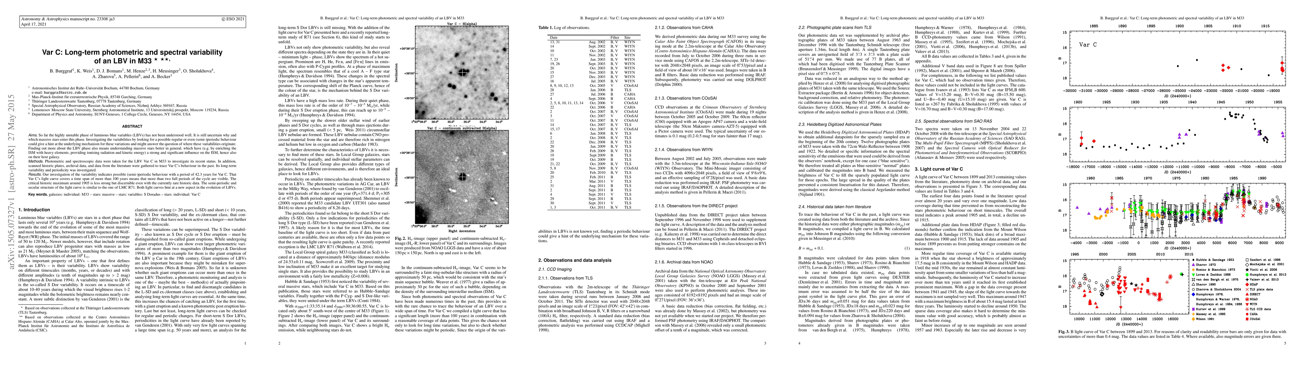 So far the highly unstable phase of luminous blue variables (LBVs) has not been understood well. It is still uncertain why and which massive stars enter this phase. Investigating the variabilities by looking for a possible regular or even (semi-)periodic behaviour could give a hint at the underlying mechanism for these variations and might answer the question of where these variabilities originate. Finding out more about the LBV phase also means understanding massive stars better in general, which have (e.g. by enriching the ISM with heavy elements, providing ionising radiation and kinetic energy) a strong and significant influence on the ISM, hence also on their host galaxy. Photometric and spectroscopic data were taken for the LBV Var C in M33 to investigate its recent status. In addition, scanned historic plates, archival data, and data from the literature were gathered to trace Var C's behaviour in the past. Its long-term variability and periodicity was investigated. Our investigation of the variability indicates possible (semi-)periodic behaviour with a period of 42.3 years for Var C. That Var C's light curve covers a time span of more than 100 years means that more than two full periods of the cycle are visible. The critical historic maximum around 1905 is less strong but discernible even with the currently rare historic data. The semi-periodic and secular structure of the light curve is similar to the one of LMC R71. Both light curves hint at a new aspect in the evolution of LBVs.