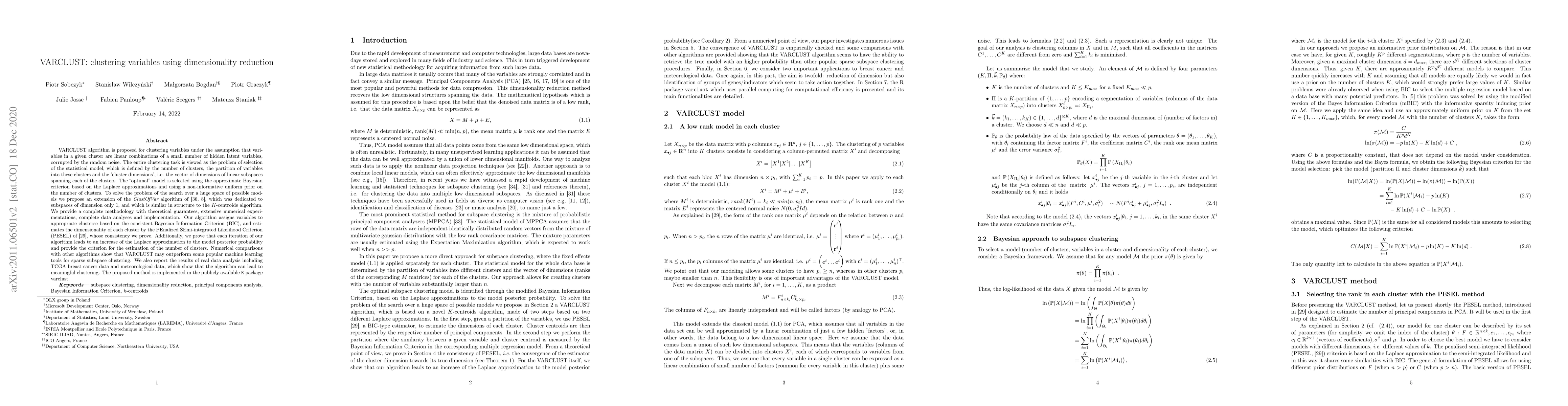 The VARCLUST algorithm clusters variables by identifying linear combinations of latent variables, optimizing the model using the Bayesian Information Criterion and PESEL. It outperforms other methods in sparse subspace clustering, as demonstrated through extensive numerical experiments and real data analysis.