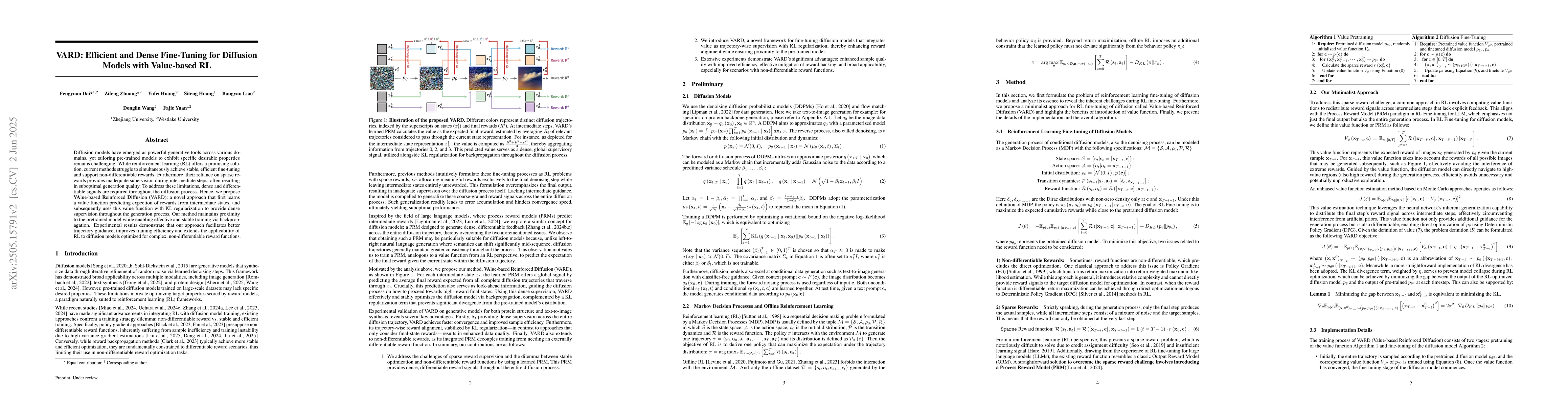 This paper proposes VARD, a method that combines value-based RL with KL regularization to improve fine-tuning of diffusion models for complex reward functions, leading to better generation quality and training efficiency.
