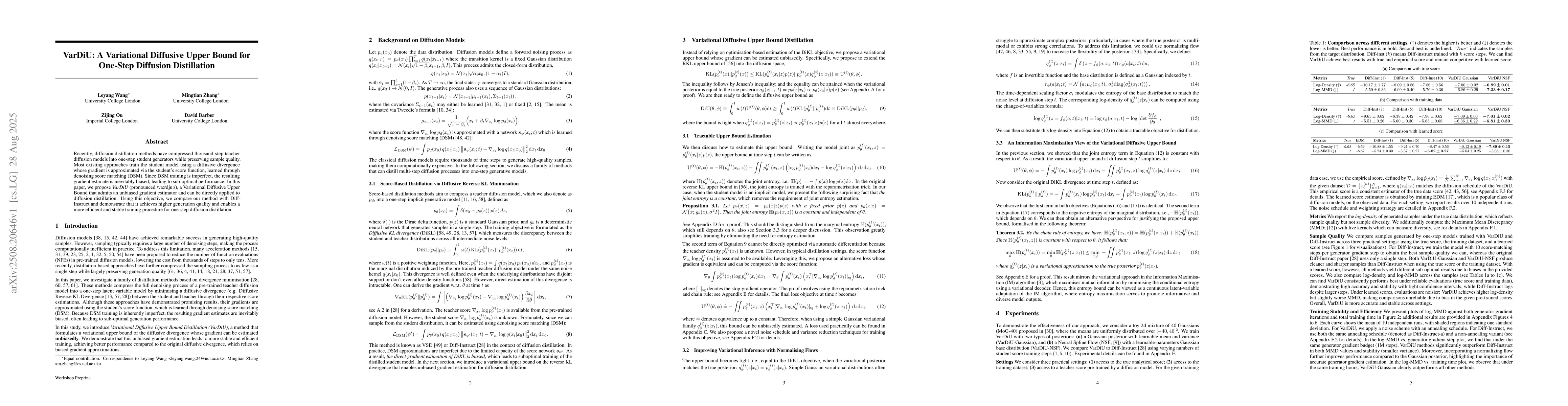 Recently, diffusion distillation methods have compressed thousand-step teacher diffusion models into one-step student generators while preserving sample quality. Most existing approaches train the student model using a diffusive divergence whose gradient is approximated via the student's score function, learned through denoising score matching (DSM). Since DSM training is imperfect, the resulting gradient estimate is inevitably biased, leading to sub-optimal performance. In this paper, we propose VarDiU (pronounced /va:rdju:/), a Variational Diffusive Upper Bound that admits an unbiased gradient estimator and can be directly applied to diffusion distillation. Using this objective, we compare our method with Diff-Instruct and demonstrate that it achieves higher generation quality and enables a more efficient and stable training procedure for one-step diffusion distillation.