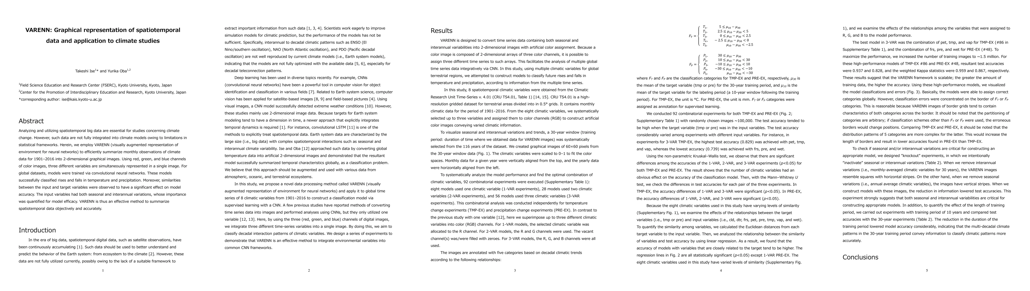 VARENN visually represents spatiotemporal climate data from 1901-2016 into 2D images, enabling efficient analysis of monthly observations. The method uses color channels to depict multiple variables and trains convolutional neural networks to classify climate trends, demonstrating significant model accuracy influenced by input variable similarities.