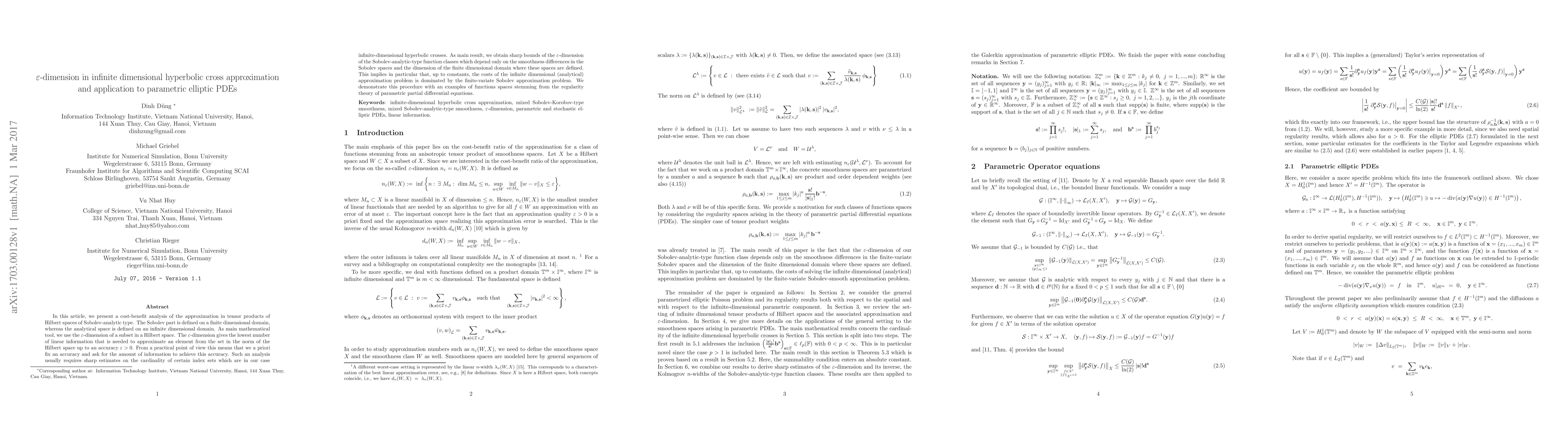 In this article, we present a cost-benefit analysis of the approximation in tensor products of Hilbert spaces of Sobolev-analytic type. The Sobolev part is defined on a finite dimensional domain, whereas the analytical space is defined on an infinite dimensional domain. As main mathematical tool, we use the $\varepsilon$-dimension of a subset in a Hilbert space. The $\varepsilon$-dimension gives the lowest number of linear information that is needed to approximate an element from the set in the norm of the Hilbert space up to an accuracy $\varepsilon>0$. From a practical point of view this means that we a priori fix an accuracy and ask for the amount of information to achieve this accuracy. Such an analysis usually requires sharp estimates on the cardinality of certain index sets which are in our case infinite-dimensional hyperbolic crosses. As main result, we obtain sharp bounds of the $\varepsilon$-dimension of the Sobolev-analytic-type function classes which depend only on the smoothness differences in the Sobolev spaces and the dimension of the finite dimensional domain where these spaces are defined. This implies in particular that, up to constants, the costs of the infinite dimensional (analytical) approximation problem is dominated by the finite-variate Sobolev approximation problem. We demonstrate this procedure with an examples of functions spaces stemming from the regularity theory of parametric partial differential equation.