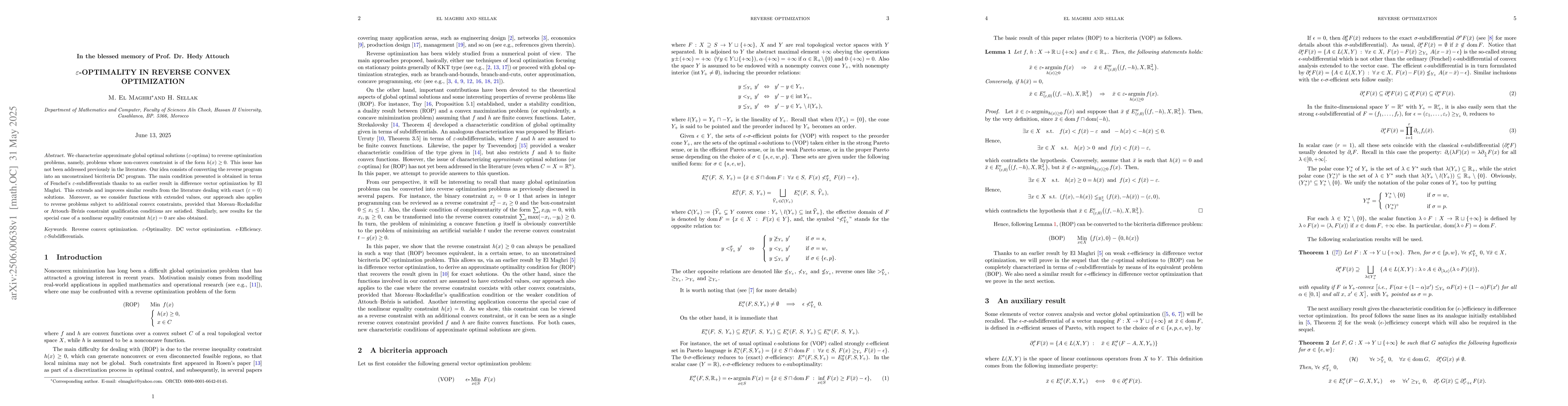 We characterize approximate global optimal solutions (${\varepsilon}$-optima) to reverse optimization problems, namely, problems whose non-convex constraint is of the form $h(x) \geq 0$. This issue has not been addressed previously in the literature. Our idea consists of converting the reverse program into an unconstrained bicriteria DC program. The main condition presented is obtained in terms of Fenchel's ${\varepsilon}$-subdifferentials thanks to an earlier result in difference vector optimization by El Maghri. This extends and improves similar results from the literature dealing with exact (${\varepsilon} = 0$) solutions. Moreover, as we consider functions with extended values, our approach also applies to reverse problems subject to additional convex constraints, provided that Moreau-Rockafellar or Attouch-Br\'ezis constraint qualification conditions are satisfied. Similarly, new results for the special case of a nonlinear equality constraint $h(x) = 0$ are also obtained.