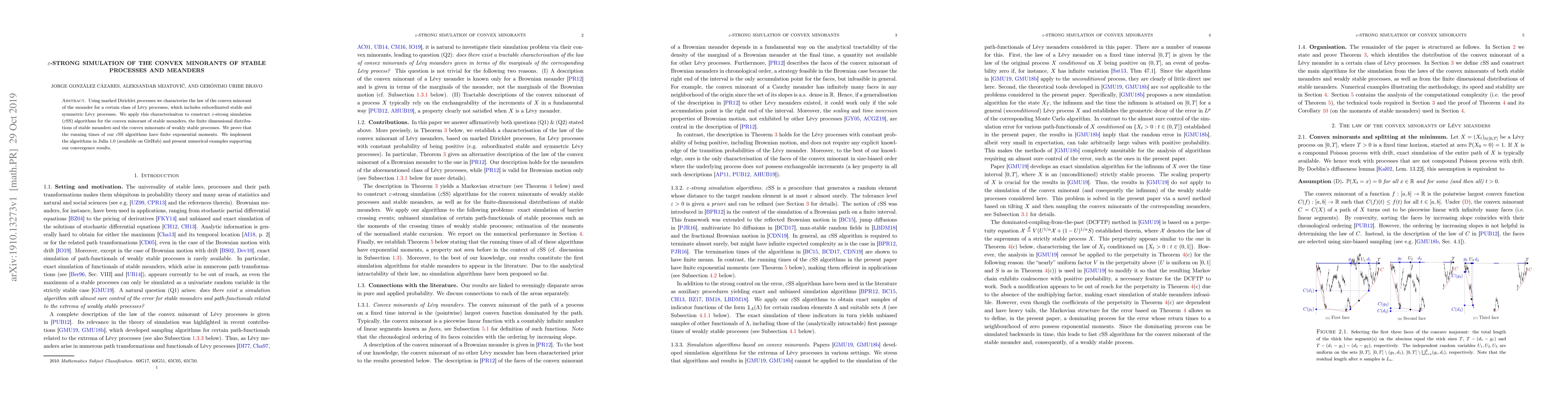 This paper characterizes the law of the convex minorant of meander processes for a class of Lévy processes using marked Dirichlet processes, and develops ε-strong simulation algorithms for stable meanders and weakly stable processes. The algorithms are shown to have finite exponential moments, and are implemented in Julia with supporting numerical examples.