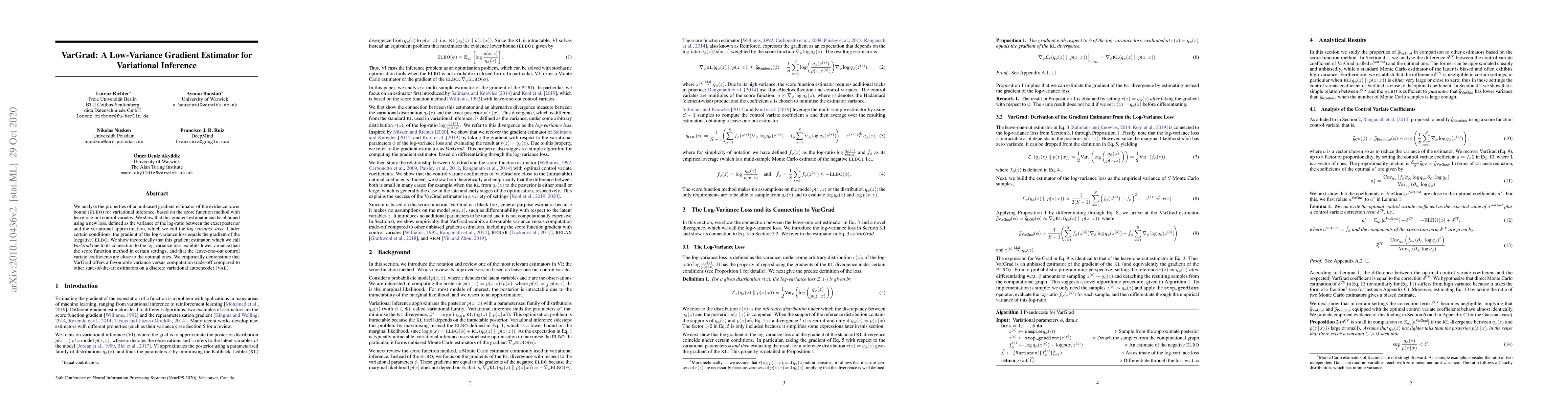 VarGrad is a low-variance gradient estimator for variational inference, utilizing the log-variance loss to achieve lower variance than traditional methods. Empirical results show it offers a favorable trade-off between variance and computational cost on a discrete VAE.