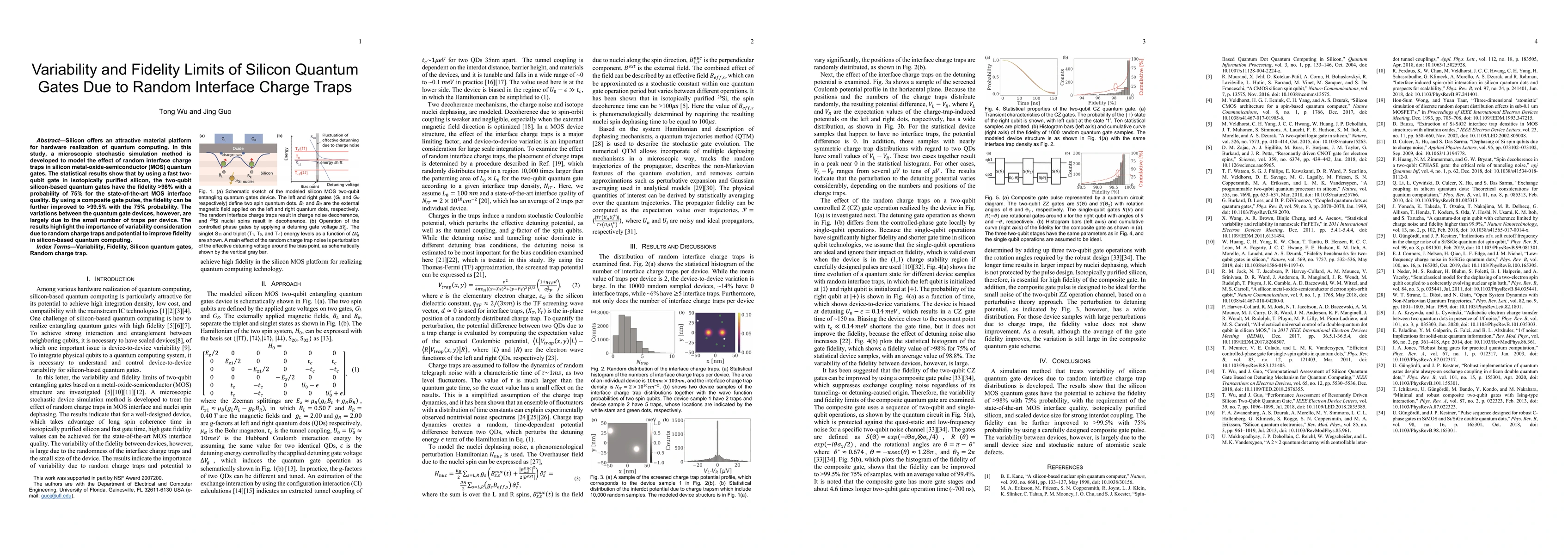 Silicon offers an attractive material platform for hardware realization of quantum computing. In this study, a microscopic stochastic simulation method is developed to model the effect of random interface charge traps in silicon metal-oxide-semiconductor (MOS) quantum gates. The statistical results show that by using a fast two-qubit gate in isotopically purified silicon, the two-qubit silicon-based quantum gates have the fidelity >98% with a probability of 75% for the state-of-the-art MOS interface quality. By using a composite gate pulse, the fidelity can be further improved to >99.5% with the 75% probability. The variations between the quantum gate devices, however, are largely due to the small number of traps per device. The results highlight the importance of variability consideration due to random charge traps and potential to improve fidelity in silicon-based quantum computing.