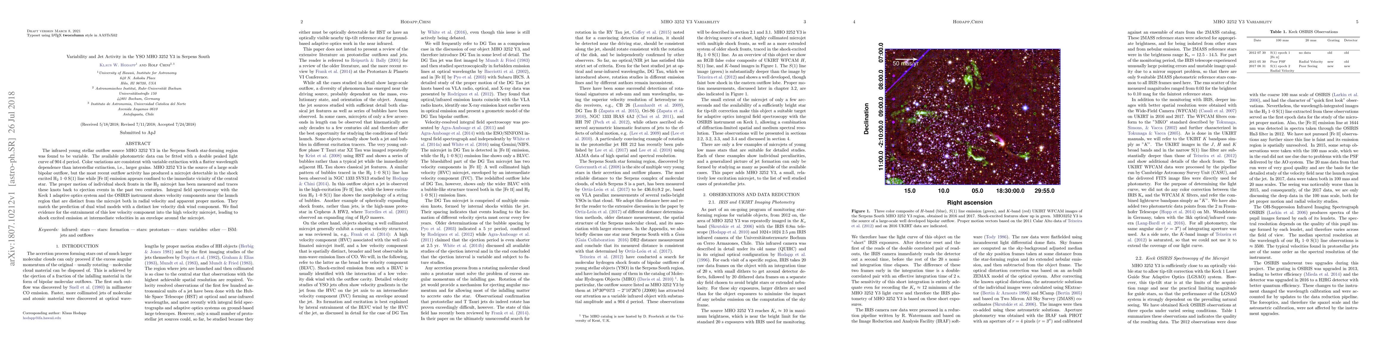 The infrared young stellar outflow source MHO 3252 Y3 in the Serpens South star-forming region was found to be variable. The available photometric data can be fitted with a double peaked light curve of 904 d period. Color variations are consistent with variable extinction with a flatter wavelength dependence than interstellar extinction, i.e., larger grains. MHO 3252 Y3 is the source of a large scale bipolar outflow, but the most recent outflow activity has produced a microjet detectable in the shock excited H_2 1--0 S(1) line while [FeII] emission appears confined to the immediate vicinity of the central star. The proper motion of individual shock fronts in the H_2 microjet has been measured and traces these knots back to ejection events in the past two centuries. Integral field spectroscopy with the Keck 1 adaptive optics system and the OSIRIS instrument shows velocity components near the launch region that are distinct from the microjet both in radial velocity and apparent proper motion. They match the prediction of dual wind models with a distinct low velocity disk wind component. We find evidence for the entrainment of this low velocity component into the high velocity microjet, leading to shock excited emission at intermediate velocities in an envelope around the microjet.