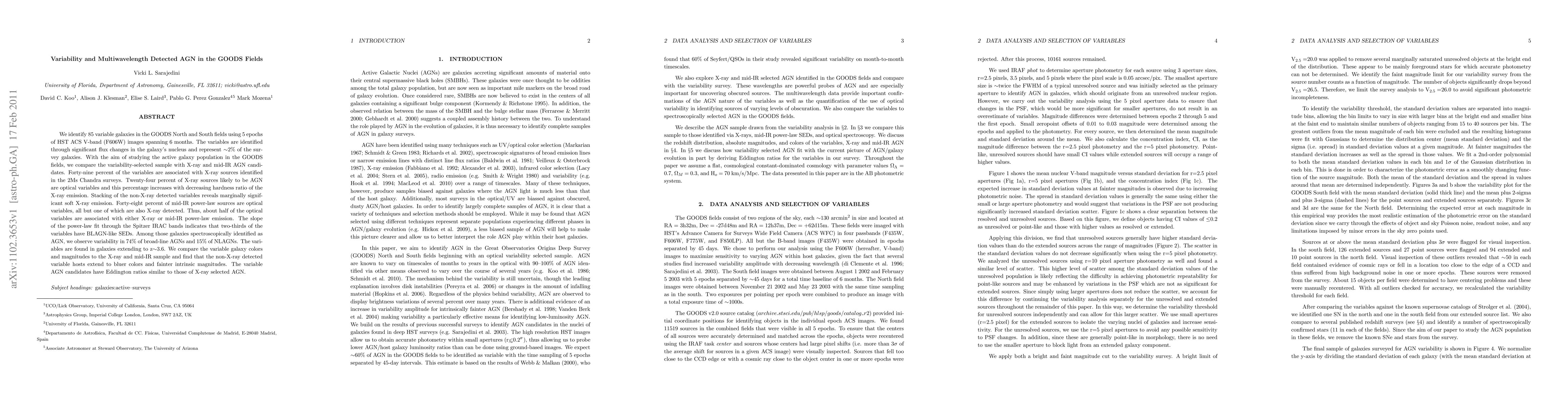 This study identifies 85 variable galaxies in the GOODS fields using HST ACS images, finding that about half exhibit X-ray or mid-IR AGN characteristics, with most having broad-line AGN-like SEDs. Non-X-ray detected variables tend to have bluer colors and fainter magnitudes.