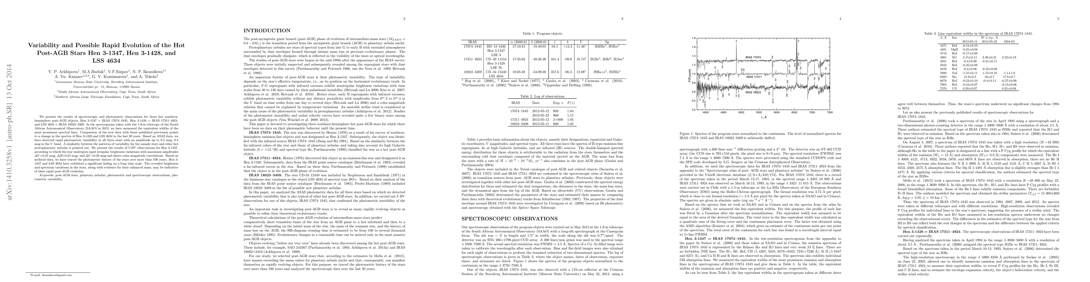 We present the results of spectroscopic and photometric observations for three hot southern-hemisphere post-AGB objects, Hen 3-1347 = IRAS 17074-1845, Hen 3-1428 = IRAS17311-4924, and LSS 4634 = IRAS 18023-3409. In the spectrograms taken with the 1.9-m telescope of the South African Astronomical Observatory (SAAO) in 2012, we have measured the equivalent widths of the most prominent spectral lines. Comparison of the new data with those published previously points to a change in the spectra of Hen 3-1428 and LSS 4634 in the last 20 years. Based on ASAS data, we have detected rapid photometric variability in all three stars with an amplitude up to 0.3 mag, 0.4 mag in the $V$ band. A similarity between the patterns of variability for the sample stars and other hot protoplanetary nebulae is pointed out. We present the results of $UBV$ observations for Hen 3-1347, according to which the star undergoes rapid irregular brightness variations with maximum amplitudes $\Delta V$=0.25 mag, $\Delta B$=0.25 mag, and $\Delta U$=0.30 mag and shows color-magnitude correlations. Based on archival data, we have traced the photometric history of the stars over more than 100 years. Hen 3-1347 and LSS 4634 have exhibited a significant fading on a long time scale. The revealed brightness and spectrum variations in the stars, along with evidence for their enhanced mass, may be indicative of their rapid post-AGB evolution.