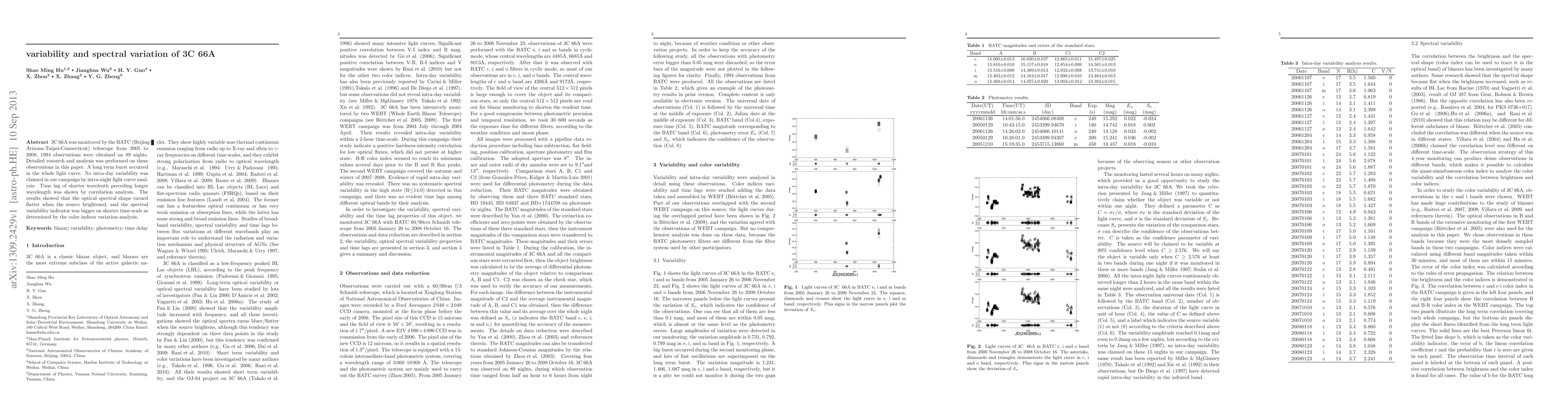 3C 66A was monitored by the BATC(Beijing-Arizona-Taipei-Connecticut) telescope from 2005 to 2008,1994 observations were obtained on 89 nights. Detailed research and analysis was performed on these observations in this paper. A long term burst occurred in the whole light curve. No intra-day variability was claimed in our campaign by intra-night light curve analysis. Time lag of shorter wavelenth preceding longer wavelength was shown by correlation analysis. The results showed that the optical spectral shape turned flatter when the source brightened, and the spectral variability indicator was bigger on shorter time-scale as determined by the color indices variation analysis.