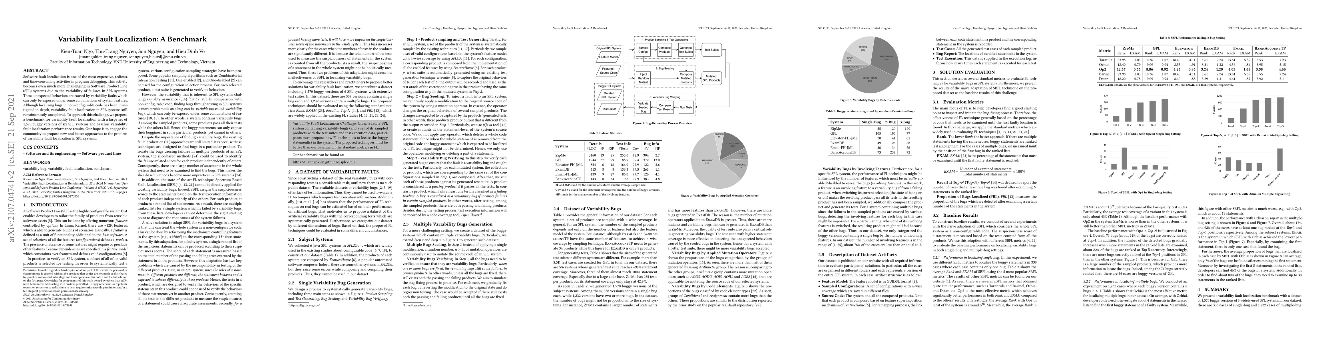 This paper introduces a benchmark for variability fault localization in Software Product Line (SPL) systems, featuring 1,570 buggy versions of six SPL systems. The goal is to stimulate research into more effective methods for localizing faults that arise from the variability of system features.