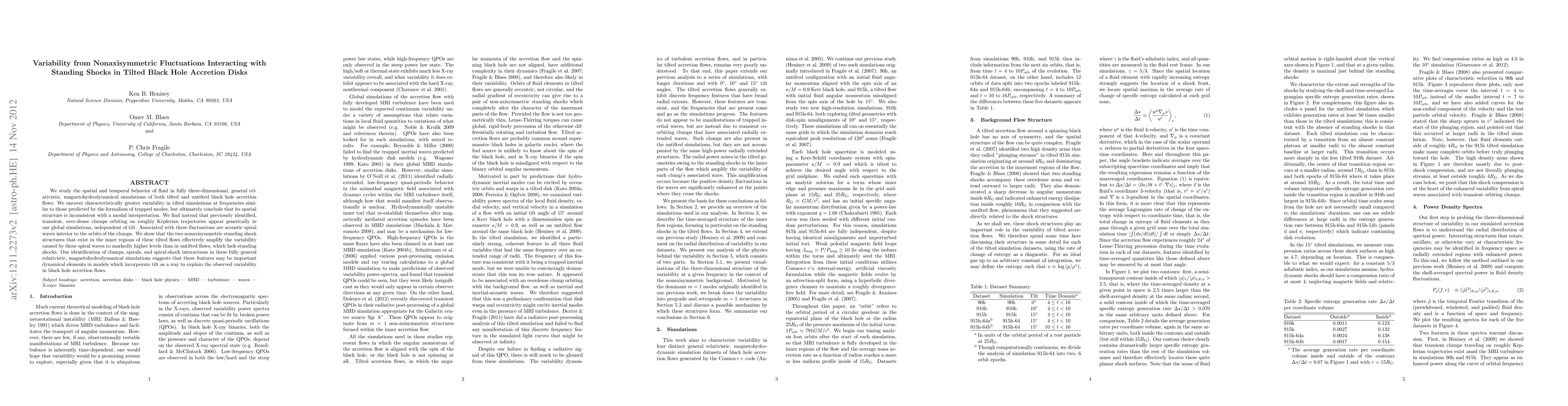 We study the spatial and temporal behavior of fluid in fully three-dimensional, general relativistic, magnetohydrodynamical simulations of both tilted and untilted black hole accretion flows. We uncover characteristically greater variability in tilted simulations at frequencies similar to those predicted by the formalism of trapped modes, but ultimately conclude that its spatial structure is inconsistent with a modal interpretation. We find instead that previously identified, transient, over-dense clumps orbiting on roughly Keplerian trajectories appear generically in our global simulations, independent of tilt. Associated with these fluctuations are acoustic spiral waves interior to the orbits of the clumps. We show that the two nonaxisymmetric standing shock structures that exist in the inner regions of these tilted flows effectively amplify the variability caused by these spiral waves to markedly higher levels than in untilted flows, which lack standing shocks. Our identification of clumps, spirals, and spiral-shock interactions in these fully general relativistic, magnetohydrodynamical simulations suggests that these features may be important dynamical elements in models which incorporate tilt as a way to explain the observed variability in black hole accretion flows.