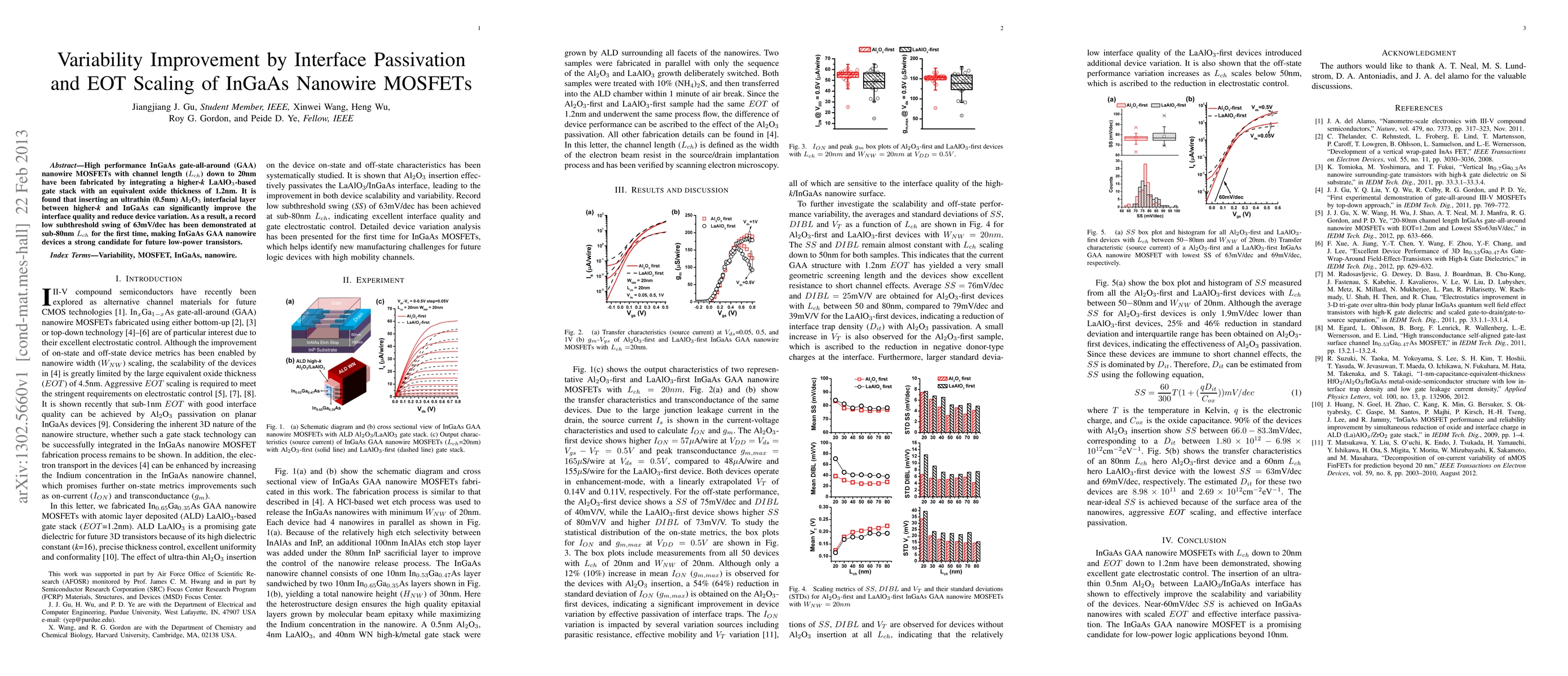 This research demonstrates the fabrication of high-performance InGaAs gate-all-around nanowire MOSFETs with a record low subthreshold swing of 63mV/dec. The insertion of a thin Al2O3 interfacial layer enhances interface quality and reduces device variability, positioning InGaAs nanowire devices as promising candidates for future low-power transistors.