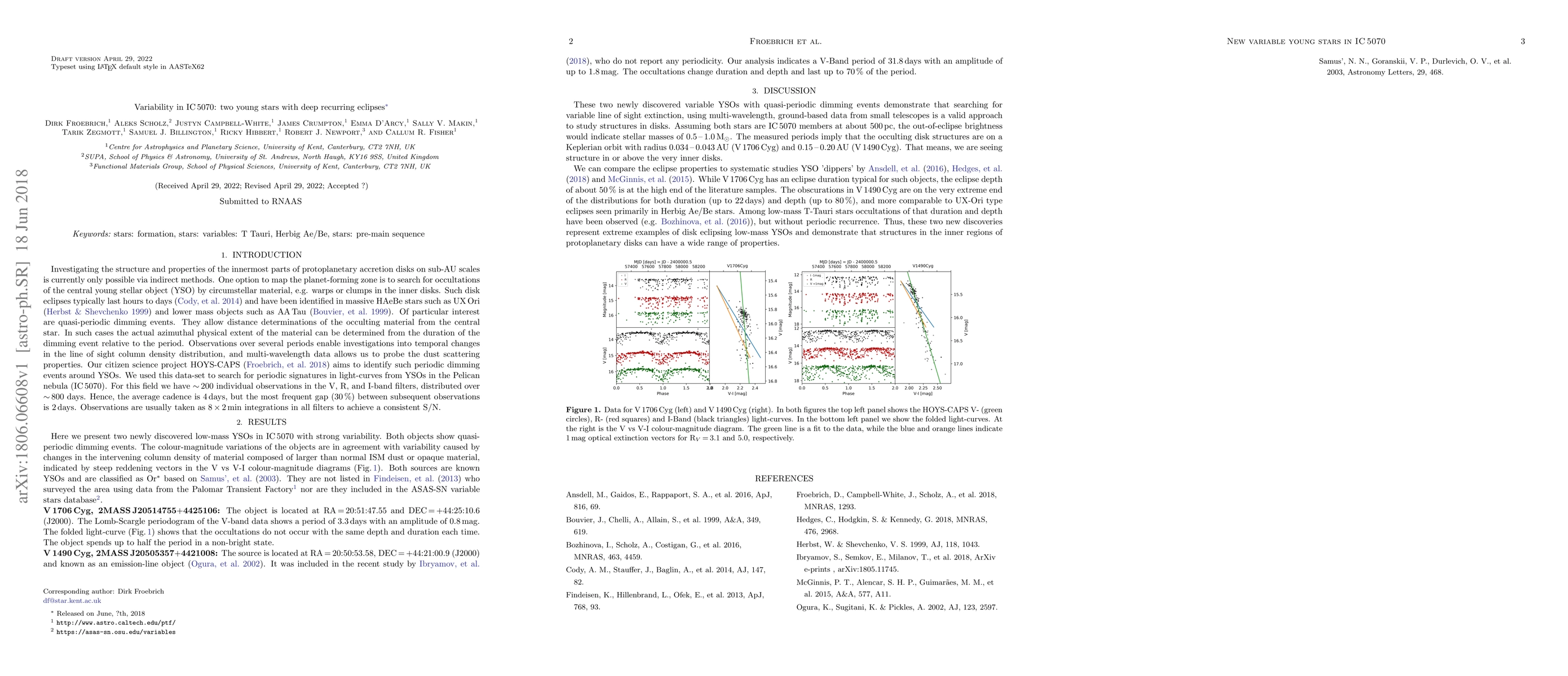 Summary: The paper investigates two young low-mass stars in the IC5070 region, V1490Cyg and V1706Cyg, which exhibit deep and recurring eclipses, providing insights into their variability and potential binary nature.
