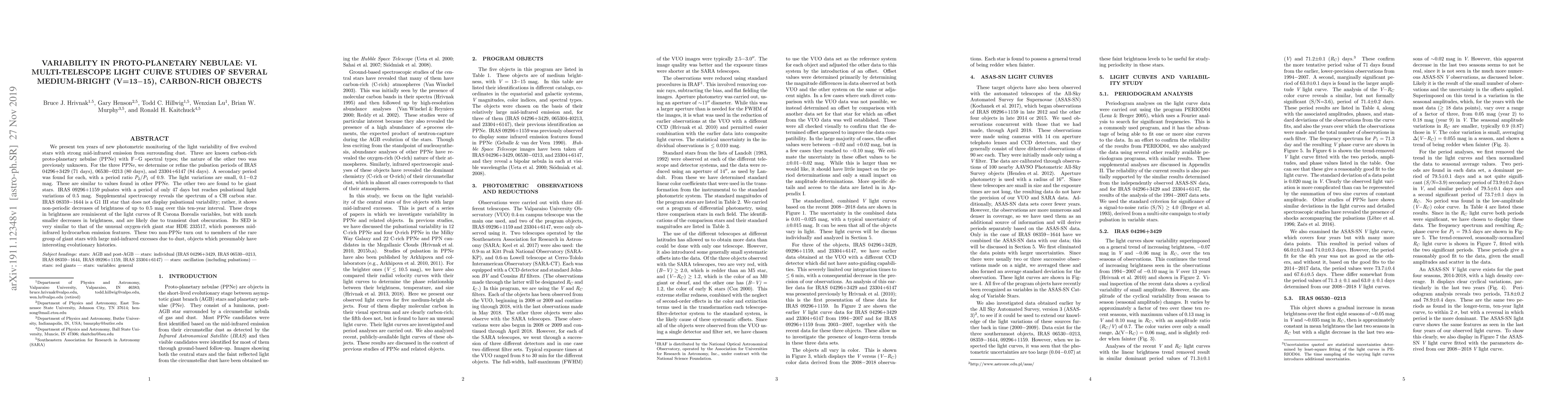 This paper presents a decade of photometric monitoring of five evolved stars, identifying pulsation periods for three carbon-rich proto-planetary nebulae and revealing that two others are giant stars with unusual mid-infrared characteristics, likely due to transient dust obscuration.