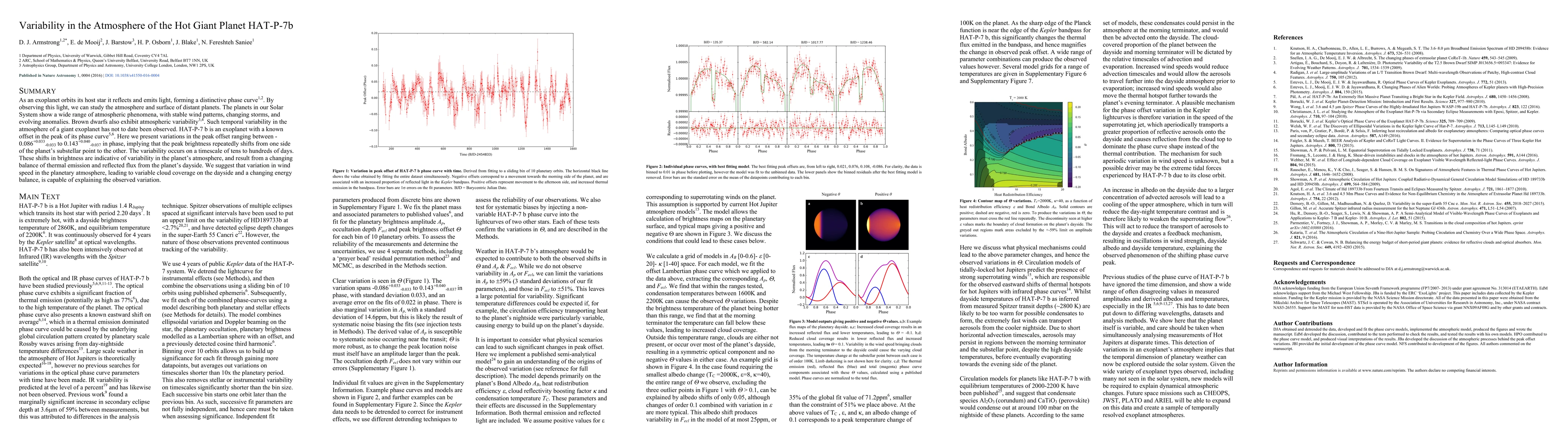 The HAT-P-7 b exoplanet exhibits variability in its atmosphere, with peak brightness shifting between daysides due to changing wind speeds and cloud coverage, observed on a timescale of tens to hundreds of days.