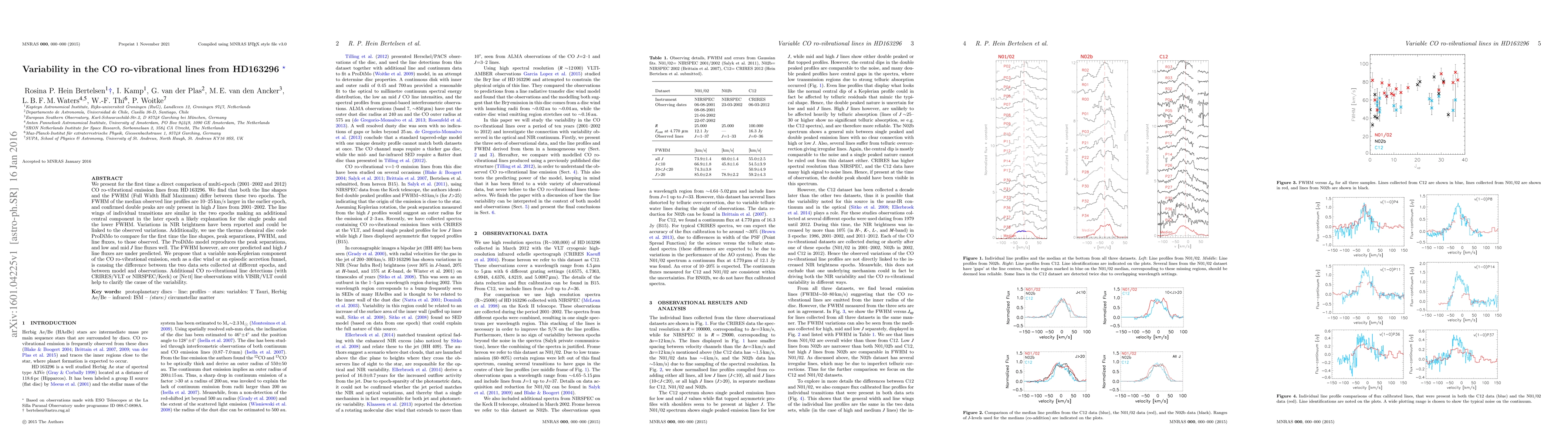 We present for the first time a direct comparison of multi-epoch (2001-2002 and 2012) CO ro-vibrational emission lines from HD163296. We find that both the line shapes and the FWHM (Full Width Half Maximum) differ between these two epochs. The FWHM of the median observed line profiles are 10-25 km/s larger in the earlier epoch, and confirmed double peaks are only present in high J lines from 2001-2002. The line wings of individual transitions are similar in the two epochs making an additional central component in the later epoch a likely explanation for the single peaks and the lower FWHM. Variations in NIR brightness have been reported and could be linked to the observed variations. Additionally, we use the thermo chemical disc code ProDiMo to compare for the first time the line shapes, peak separations, FWHM, and line fluxes, to those observed. The ProDiMo model reproduces the peak separations, and low and mid J line fluxes well. The FWHM however, are over predicted and high J line fluxes are under predicted. We propose that a variable non-Keplerian component of the CO ro-vibrational emission, such as a disc wind or an episodic accretion funnel, is causing the difference between the two data sets collected at different epochs, and between model and observations. Additional CO ro-vibrational line detections (with CRIRES/VLT or NIRSPEC/Keck) or [Ne II] line observations with VISIR/VLT could help to clarify the cause of the variability.