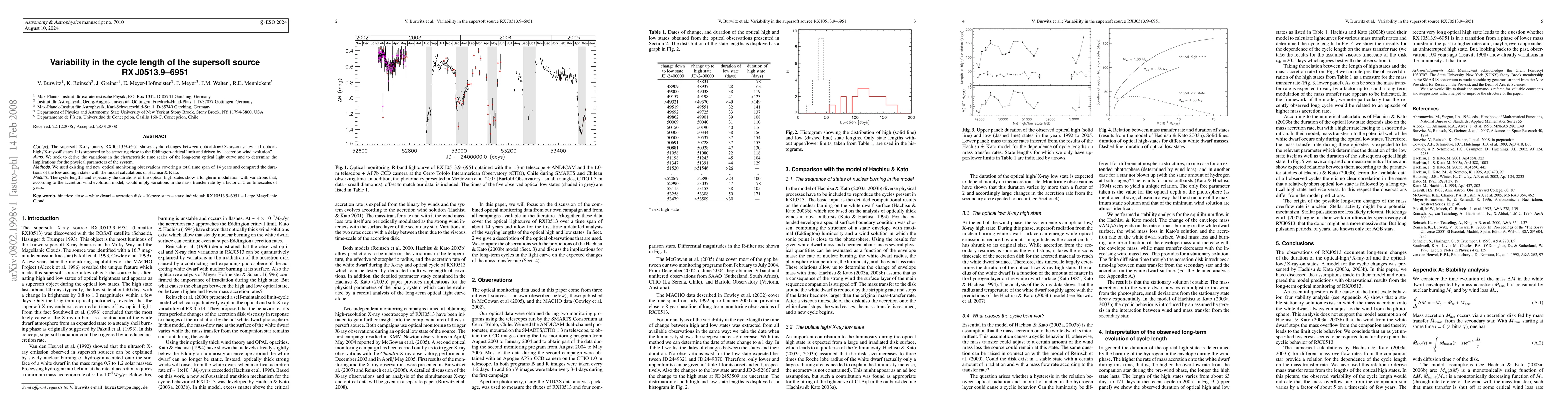 The supersoft X-ray binary RX J0513.9-6951 shows cyclic changes between optical-low / X-ray-on states and optical-high / X-ray-off states. It is supposed to be accreting close to the Eddington-critical limit and driven by "accretion wind evolution". We seek to derive the variations in the characteristic time scales of the long-term optical light curve and to determine the implications for the physical parameters of the system. We used existing and new optical monitoring observations covering a total time span of 14 years and compared the durations of the low and high states with the model calculations of Hachisu & Kato. The cycle lengths and especially the durations of the optical high states show a longterm modulation with variations that, according to the accretion wind evolution model, would imply variations in the mass transfer rate by a factor of 5 on timescales of years.