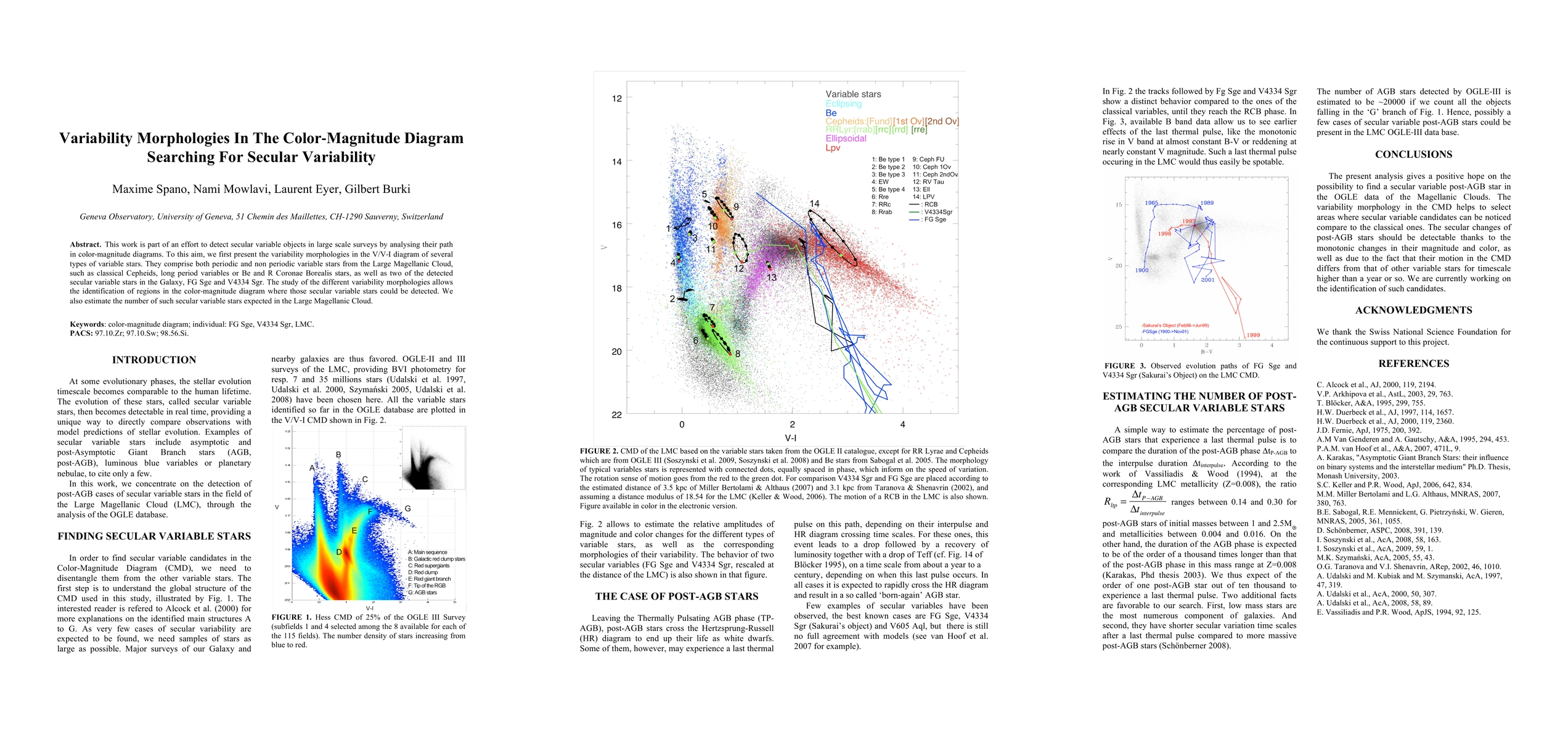 This work is part of an effort to detect secular variable objects in large scale surveys by analysing their path in color-magnitude diagrams. To this aim, we first present the variability morphologies in the V/V-I diagram of several types of variable stars. They comprise both periodic and non periodic variable stars from the Large Magellanic Cloud, such as classical Cepheids, long period variables or Be and R Coronae Borealis stars, as well as two of the detected secular variable stars in the Galaxy, FG Sge and V4334 Sgr. The study of the different variability morphologies allows the identification of regions in the color-magnitude diagram where those secular variable stars could be detected. We also estimate the number of such secular variable stars expected in the Large Magellanic Cloud.