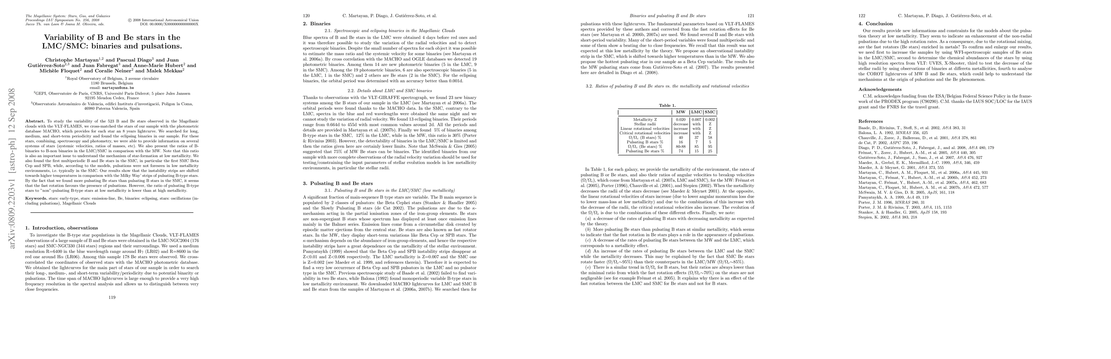 To study the variability of the 523 B and Be stars observed in the Magellanic clouds with the VLT-FLAMES, we cross-matched the stars of our sample with the photometric database MACHO, which provides for each star an 8 years lightcurve. We searched for long, medium, and short-term periodicity and found the eclipsing binaries in our sample. For these stars, combining, spectroscopy and photometry, we were able to provide information on several systems of stars (systemic velocities, ratios of masses, etc). We also present the ratios of B-binaries to B-non binaries in the LMC/SMC in comparison with the MW. Note that this ratio is also an important issue to understand the mechanism of star-formation at low metallicity. We also found the first multiperiodic B and Be stars in the SMC, in particular the first SMC Beta Cep and SPB, while, according to the models, pulsations were not foreseen in low metallicity environments, i.e. typically in the SMC. Our results show that the instability strips are shifted towards higher temperatures in comparison with the Milky Way' strips of pulsating B-type stars. By the fact that we found more pulsating Be stars than pulsating B stars in the SMC, it seems that the fast rotation favours the presence of pulsations. However, the ratio of pulsating B-type stars to "non"-pulsating B-type stars at low metallicity is lower than at high metallicity.