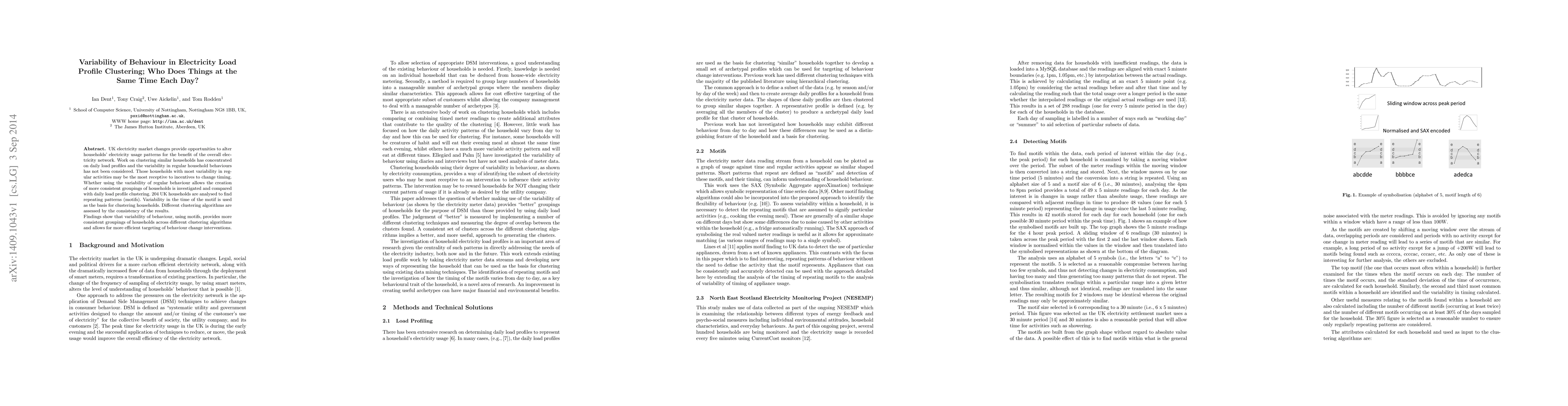 UK electricity market changes provide opportunities to alter households' electricity usage patterns for the benefit of the overall electricity network. Work on clustering similar households has concentrated on daily load profiles and the variability in regular household behaviours has not been considered. Those households with most variability in regular activities may be the most receptive to incentives to change timing. Whether using the variability of regular behaviour allows the creation of more consistent groupings of households is investigated and compared with daily load profile clustering. 204 UK households are analysed to find repeating patterns (motifs). Variability in the time of the motif is used as the basis for clustering households. Different clustering algorithms are assessed by the consistency of the results. Findings show that variability of behaviour, using motifs, provides more consistent groupings of households across different clustering algorithms and allows for more efficient targeting of behaviour change interventions.