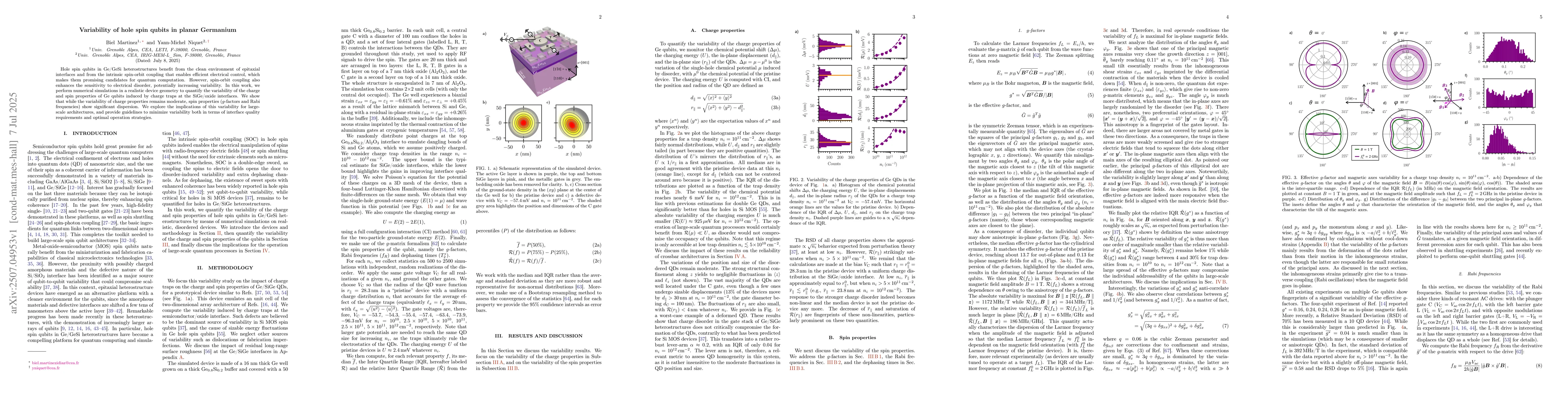 Hole spin qubits in Ge/GeSi heterostructures benefit from the clean environment of epitaxial interfaces and from the intrinsic spin-orbit coupling that enables efficient electrical control, which makes them promising candidates for quantum computation. However, spin-orbit coupling also enhances the sensitivity to electrical disorder, potentially increasing variability. In this work, we perform numerical simulations in a realistic device geometry to quantify the variability of the charge and spin properties of Ge qubits induced by charge traps at the SiGe/oxide interfaces. We show that while the variability of charge properties remains moderate, spin properties (g-factors and Rabi frequencies) show significant dispersion. We explore the implications of this variability for large-scale architectures, and provide guidelines to minimize variability both in terms of interface quality requirements and optimal operation strategies.