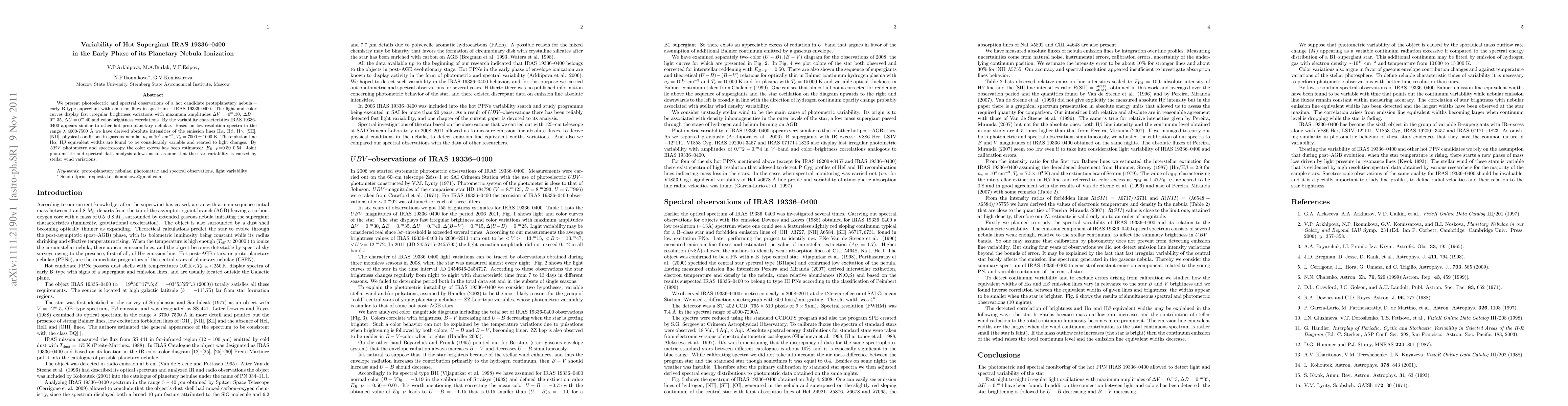 This paper investigates the variability of the hot supergiant IRAS 19336-0400, revealing fast irregular brightness changes and significant emission line variations. The star's variability is attributed to stellar wind fluctuations, with derived physical conditions indicating a gaseous nebula with high electron density and temperature.