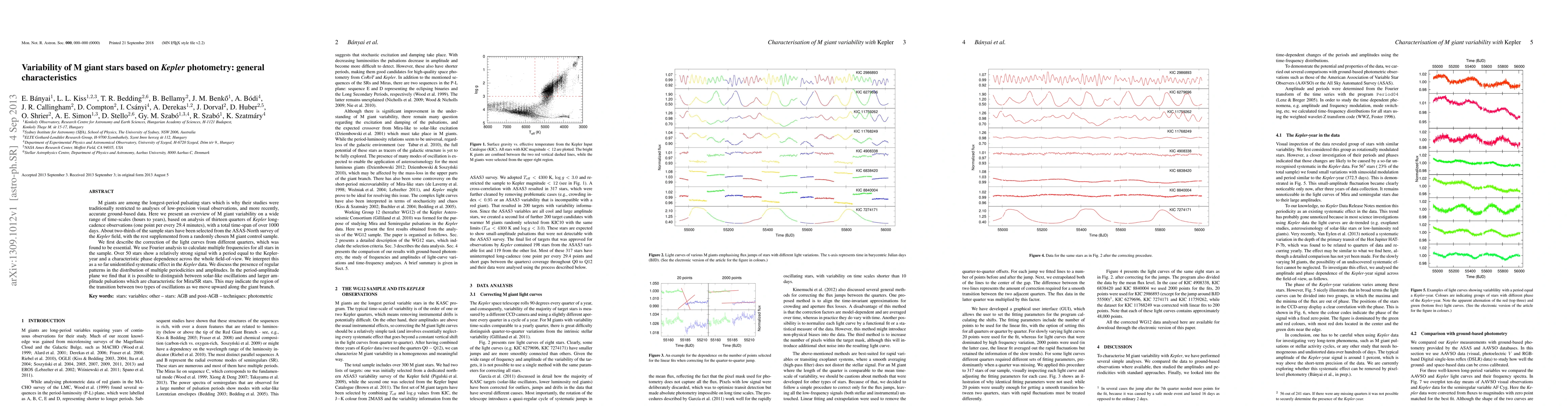 This paper provides an overview of M giant star variability observed over a wide range of time scales using Kepler photometry data, identifying systematic effects and distinguishing between solar-like oscillations and larger amplitude pulsations typical of Mira/SR stars. The study corrects light curves from different quarters and uses Fourier analysis to detect multiple periodicities.