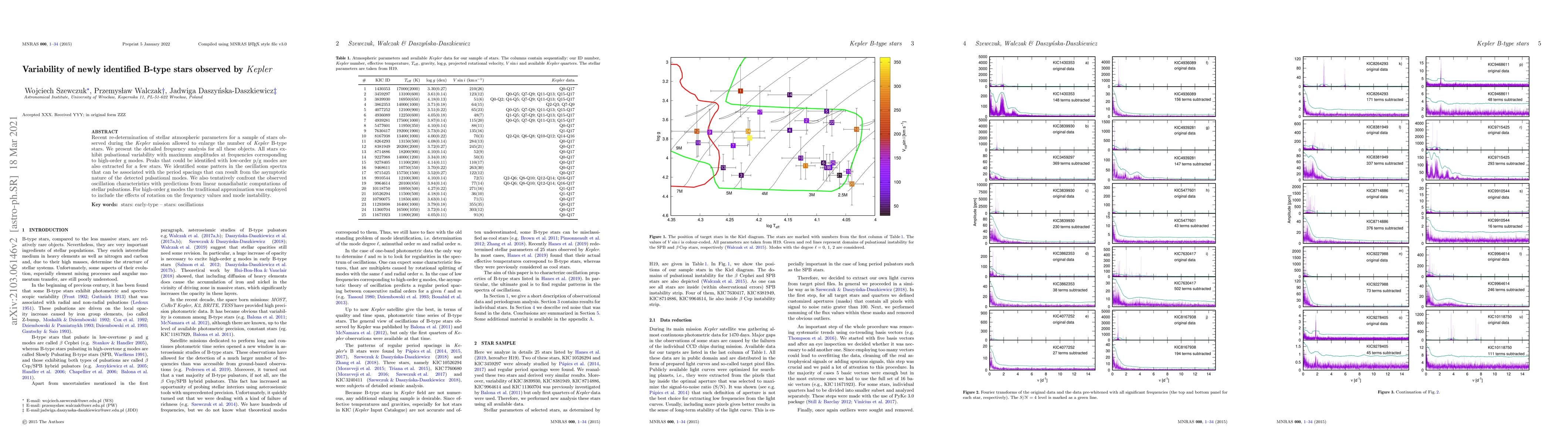 This paper presents a detailed frequency analysis of newly identified B-type stars observed by Kepler, revealing pulsational variability primarily in high-order g modes, with some low-order p/g modes also identified. The study compares observed oscillation characteristics with predictions from linear nonadiabatic computations, considering rotational effects on mode frequencies and instability.