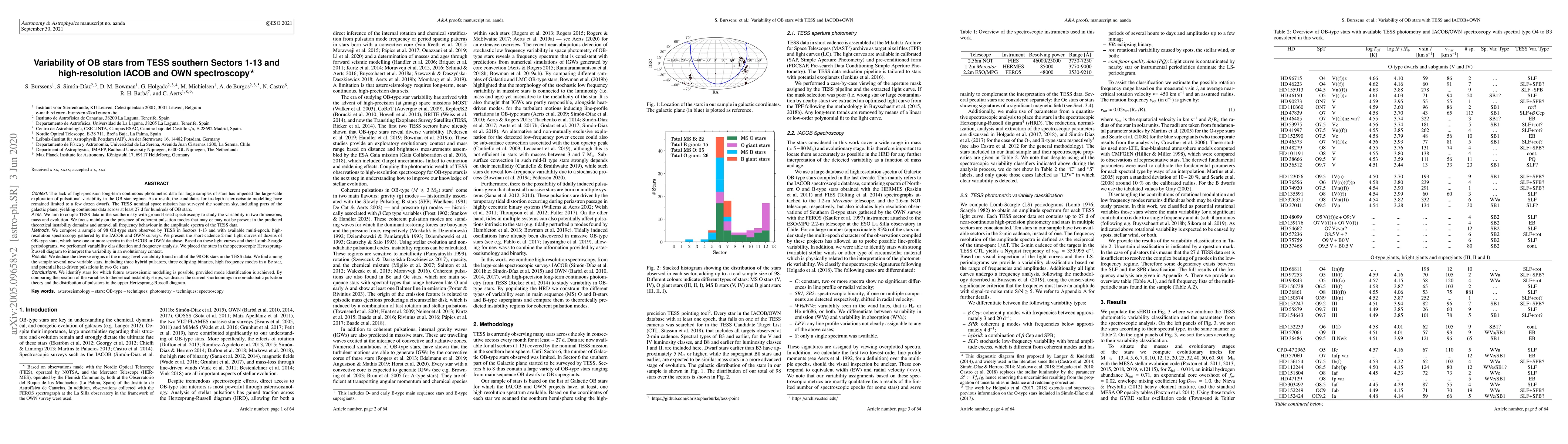 This research combines TESS photometric data with high-resolution spectroscopy to study the variability of 98 OB stars, identifying new variable stars and hybrid pulsators. The study highlights the potential for future asteroseismic modeling and discusses the limitations of current pulsation theory.