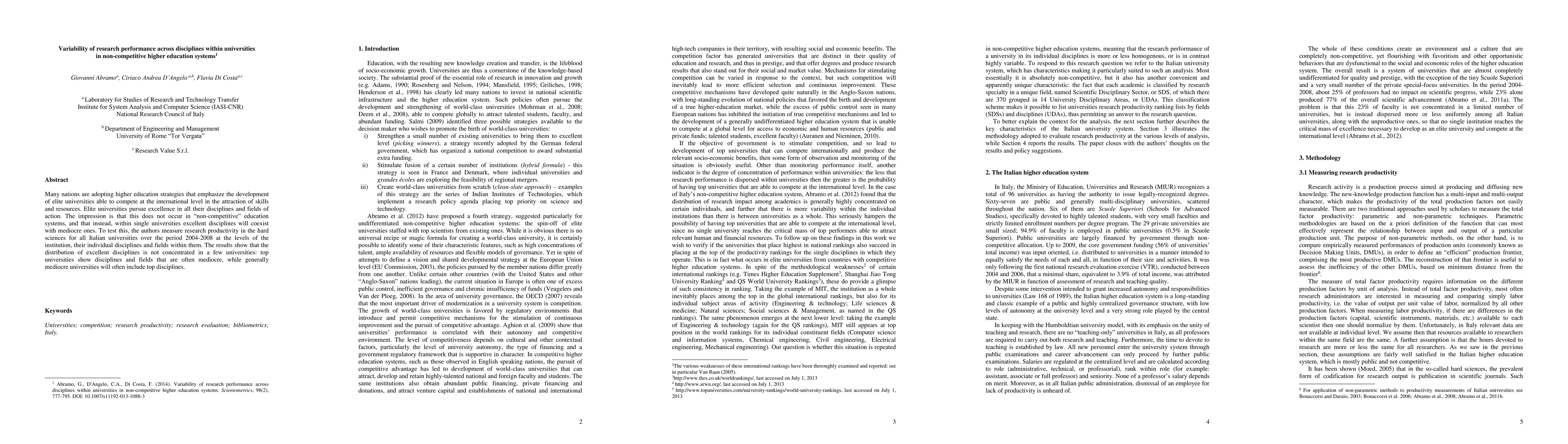 This study examines research productivity across disciplines in Italian universities from 2004-2008, finding that elite universities often have mediocre disciplines alongside top ones, contrary to the assumption that non-competitive systems house only mediocre disciplines. The research reveals a mixed distribution of excellence, challenging the notion that only a few universities dominate in all fields within non-competitive higher education systems.