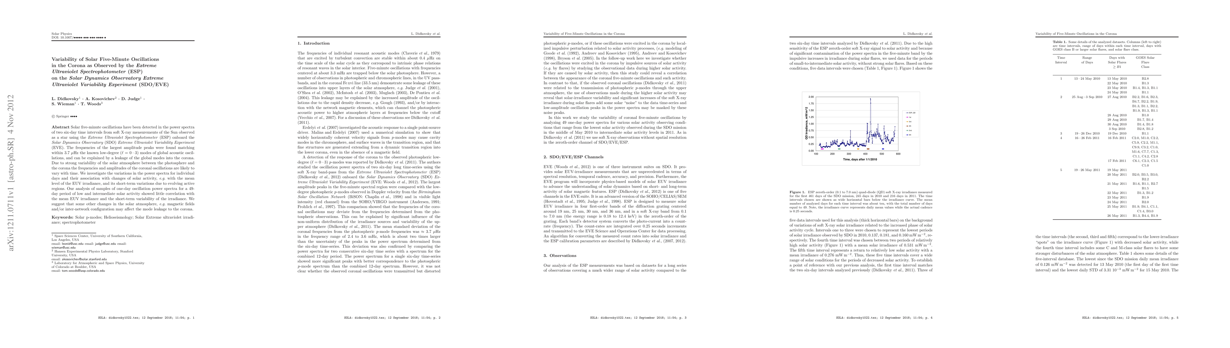 Solar five-minute oscillations have been detected in the power spectra of two six-day time intervals from soft X-ray measurements of the Sun observed as a star using the Extreme Ultraviolet Spectrophotometer (ESP) onboard the Solar Dynamics Observatory (SDO) Extreme Ultraviolet Variability Experiment (EVE). The frequencies of the largest amplitude peaks were found matching within 3.7 microHz the known low-degree (l = 0--3) modes of global acoustic oscillations, and can be explained by a leakage of the global modes into the corona. Due to strong variability of the solar atmosphere between the photosphere and the corona the frequencies and amplitudes of the coronal oscillations are likely to vary with time. We investigate the variations in the power spectra for individual days and their association with changes of solar activity, e.g. with the mean level of the EUV irradiance, and its short-term variations due to evolving active regions. Our analysis of samples of one-day oscillation power spectra for a 49-day period of low and intermediate solar activity showed little correlation with the mean EUV irradiance and the short-term variability of the irradiance. We suggest that some other changes in the solar atmosphere, e.g. magnetic fields and/or inter-network configuration may affect the mode leakage to the corona.