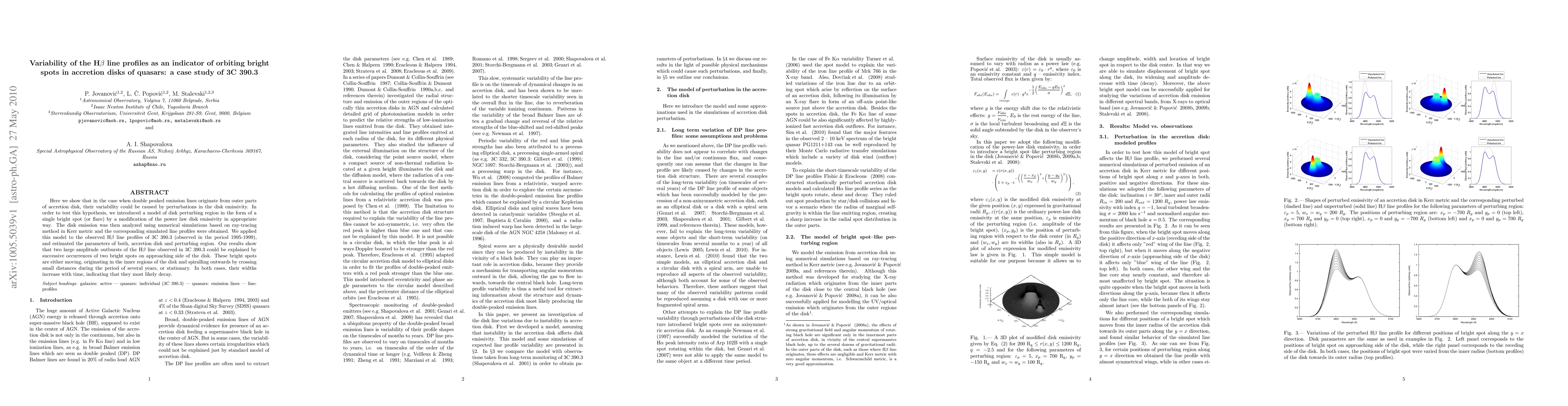 Here we show that in the case when double peaked emission lines originate from outer parts of accretion disk, their variability could be caused by perturbations in the disk emissivity. In order to test this hypothesis, we introduced a model of disk perturbing region in the form of a single bright spot (or flare) by a modification of the power law disk emissivity in appropriate way. The disk emission was then analyzed using numerical simulations based on ray-tracing method in Kerr metric and the corresponding simulated line profiles were obtained. We applied this model to the observed H-beta line profiles of 3C 390.3 (observed in the period 1995-1999), and estimated the parameters of both, accretion disk and perturbing region. Our results show that two large amplitude outbursts of the H-beta line observed in 3C 390.3 could be explained by successive occurrences of two bright spots on approaching side of the disk. These bright spots are either moving, originating in the inner regions of the disk and spiralling outwards by crossing small distances during the period of several years, or stationary. In both cases, their widths increase with time, indicating that they most likely decay.