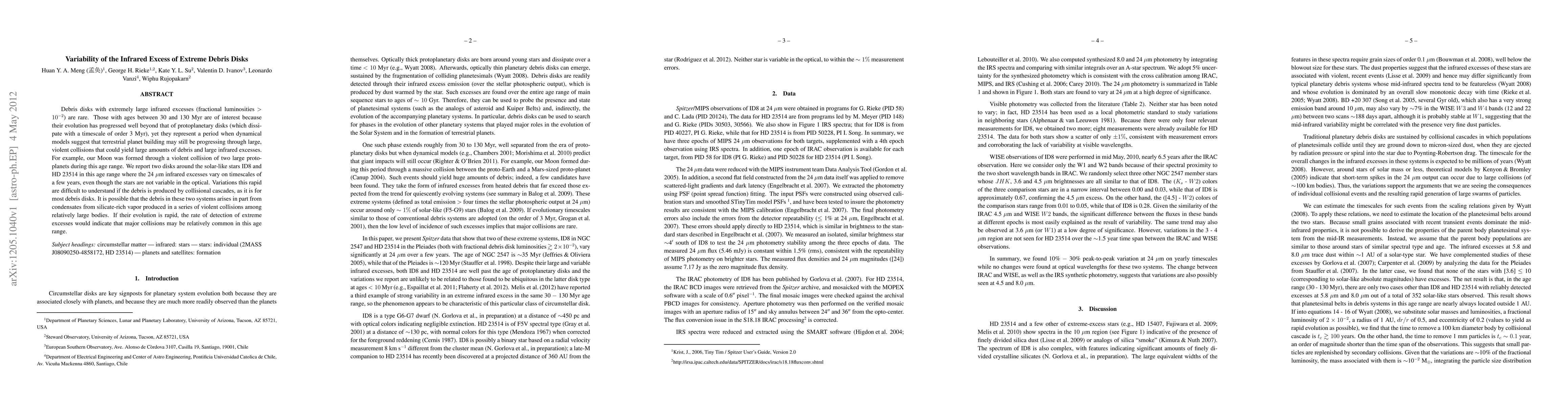 Debris disks with extremely large infrared excesses (fractional luminosities $> 10^{-2}$) are rare. Those with ages between 30 and 130 Myr are of interest because their evolution has progressed well beyond that of protoplanetary disks (which dissipate with a timescale of order 3 Myr), yet they represent a period when dynamical models suggest that terrestrial planet building may still be progressing through large, violent collisions that could yield large amounts of debris and large infrared excesses. For example, our Moon was formed through a violent collision of two large proto-planets during this age range. We report two disks around the solar-like stars ID8 and HD 23514 in this age range where the 24 {\mu}m infrared excesses vary on timescales of a few years, even though the stars are not variable in the optical. Variations this rapid are difficult to understand if the debris is produced by collisional cascades, as it is for most debris disks. It is possible that the debris in these two systems arises in part from condensates from silicate-rich vapor produced in a series of violent collisions among relatively large bodies. If their evolution is rapid, the rate of detection of extreme excesses would indicate that major collisions may be relatively common in this age range.