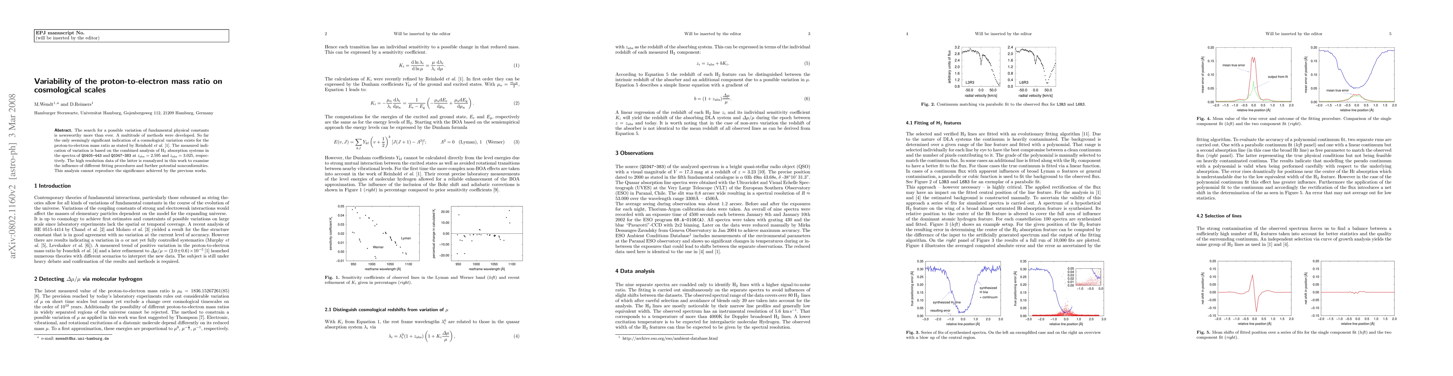 So far the only seemingly significant indication of a cosmological variation exists for the proton-to-electron mass ratio as stated by Reinhold et al. (2006). The measured indication of variation is based on the combined analysis of H2 absorption systems in the spectra of Q0405-443 and Q0347-383 at z=2.595 and z=3.025, respectively. The high resolution data of the latter is reanalyzed in this work to examine the influence of different fitting procedures and further potential nonconformities. This analysis cannot reproduce the significance achieved by the previous detection.